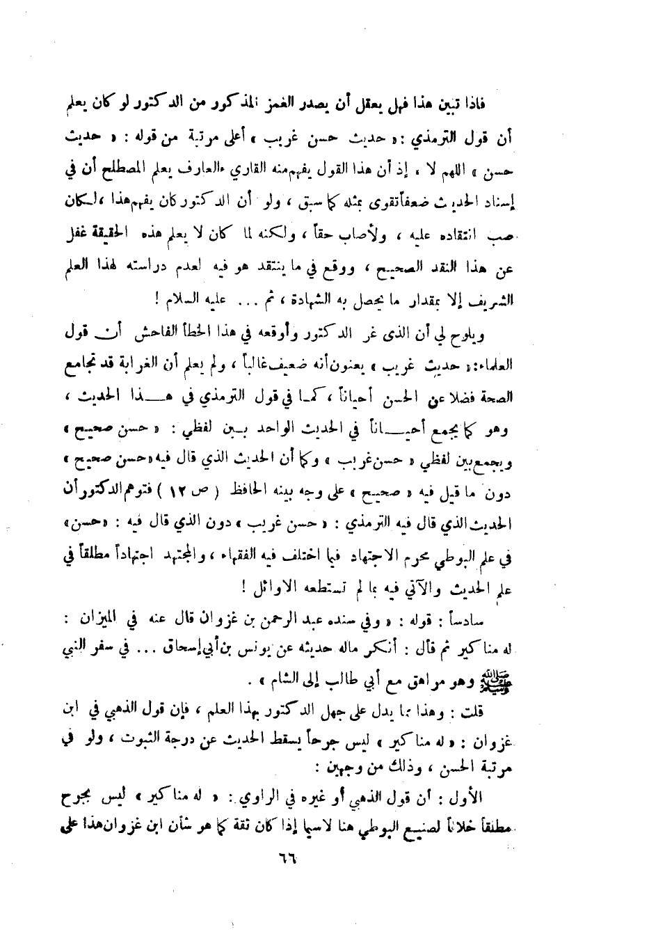 ويلوح لي أن الذي غر الدكتور وأوقعه في هذا الخطأ الفاحش أن قول العلماء: (حديث غريب) يعنون أنه ضعيف غالبا ولم يعلم أن الغرابة قد تجامع الصحة فضلا عن الحسن أحيانا كما في قول الترمذي في هذا الحديث وهو كما يجمع أحيانا في الحديث الواحد بين لفظي: (حسن صحيح) ويجمع بين لفظي (حسن غريب) وكما أن الحديث الذي قال فيه (حسن صحيح) دون ما قيل فيه (صحيح) على وجه بينه الحافظ (ص 12) فتوهم الدكتور أن الحديث الذي قال فيه الترمذي: (حسن غريب) دون الذي قال فيه: (حسن) في علم البوطي محرم الاجتهاد فيما اختلف فيه الفقهاء والمجتهد اجتهادا مطلقا في علم الحديث والآتي فيه بما لم تستطعه الأوائل