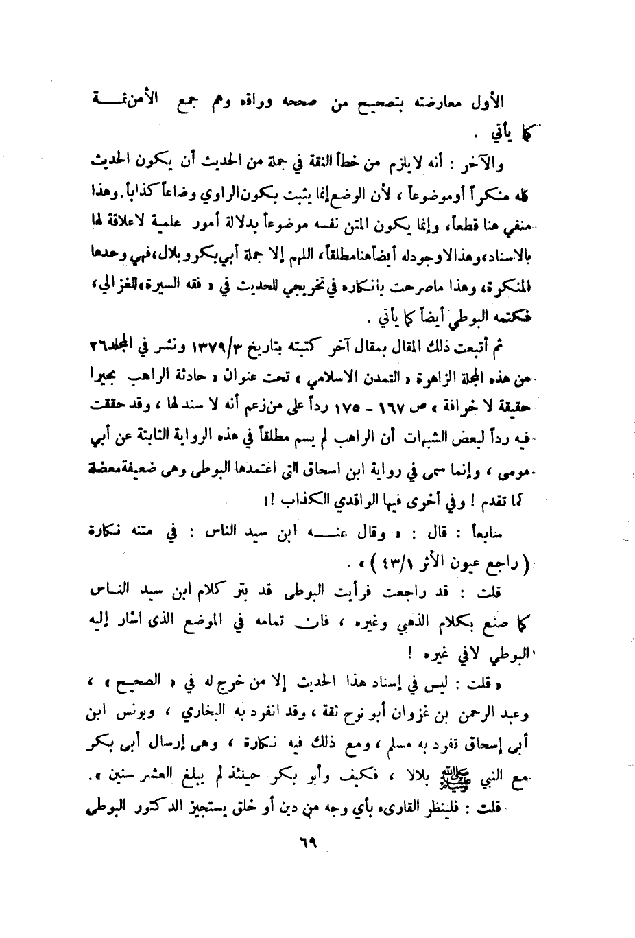 والآخر: أنه لا يلزم من خطأ الثقة في جملة من الحديث أن يكون الحديث كله منكرا أو موضوعا لأن الوضع إنما يثبت بكون الراوي وضاعا كذابا. وهذا منفي قطعا وإنما يكون المتن نفسه موضوعا بدلالة أمور علمية لا علاقة لها بالإسناد وهذا لا وجود له أيضا هنا مطلقا اللهم إلا جملة أبي بكر وبلال فهي وحدها المنكرة وهذا ما صرحت بإنكاره في تخريجي للحديث في (فقه السيرة) للغزالي فكتمه البوطي أيضا كما يأتي