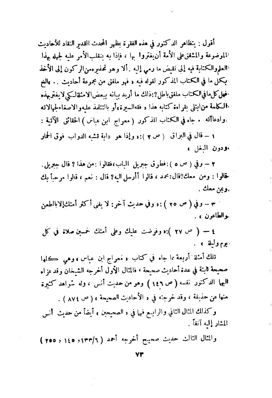 تلك أمثلة أربعة مما جاء في كتاب (معراج ابن عباس) وهي كلها صحيحة ثابتة في عدة أحاديث صحيحة فالمثال الأول أخرجه الشيخان وقد عزاه إليهما الدكتور نفسه (ص 146) وهو من حديث أنس وله شواهد كثيرة منها عن حذيفة وقد خرجته في (الأحاديث الصحيحة) (ص 874)