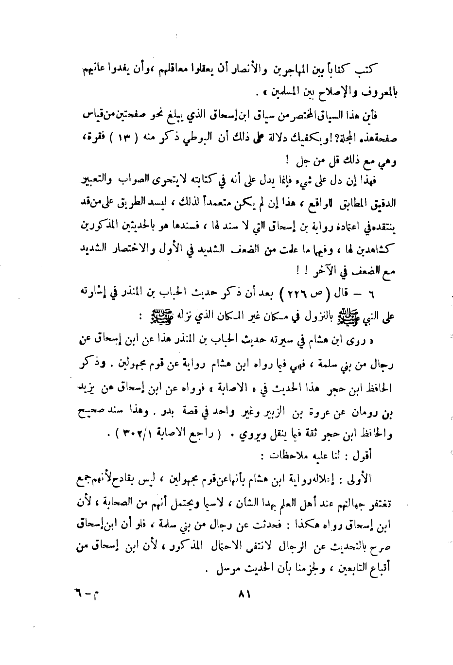 6 - قال (ص 226) بعد أن ذكر حديث الحباب بن المنذر في إشارته على النبي A بالنزول في مكان غير المكان الذي نزله A: (روى ابن هشام في سيرته حديث الحباب بن المنذر هذا عن ابن إسحاق عن رجال من بني سلمة فهي فيما رواه ابن هشام رواية عن قوم مجهولين وذكر الحافظ ابن حجر هذا الحديث في (الإصابة) فرواه عن ابن إسحاق عن يزيد بن رومان عن عروة بن الزبير وغير واحد في قصة بدر وهذا سند صحيح والحافظ ابن حجر ثقة فيما ينقل ويروي. (راجع الإصابة 1 / 302)