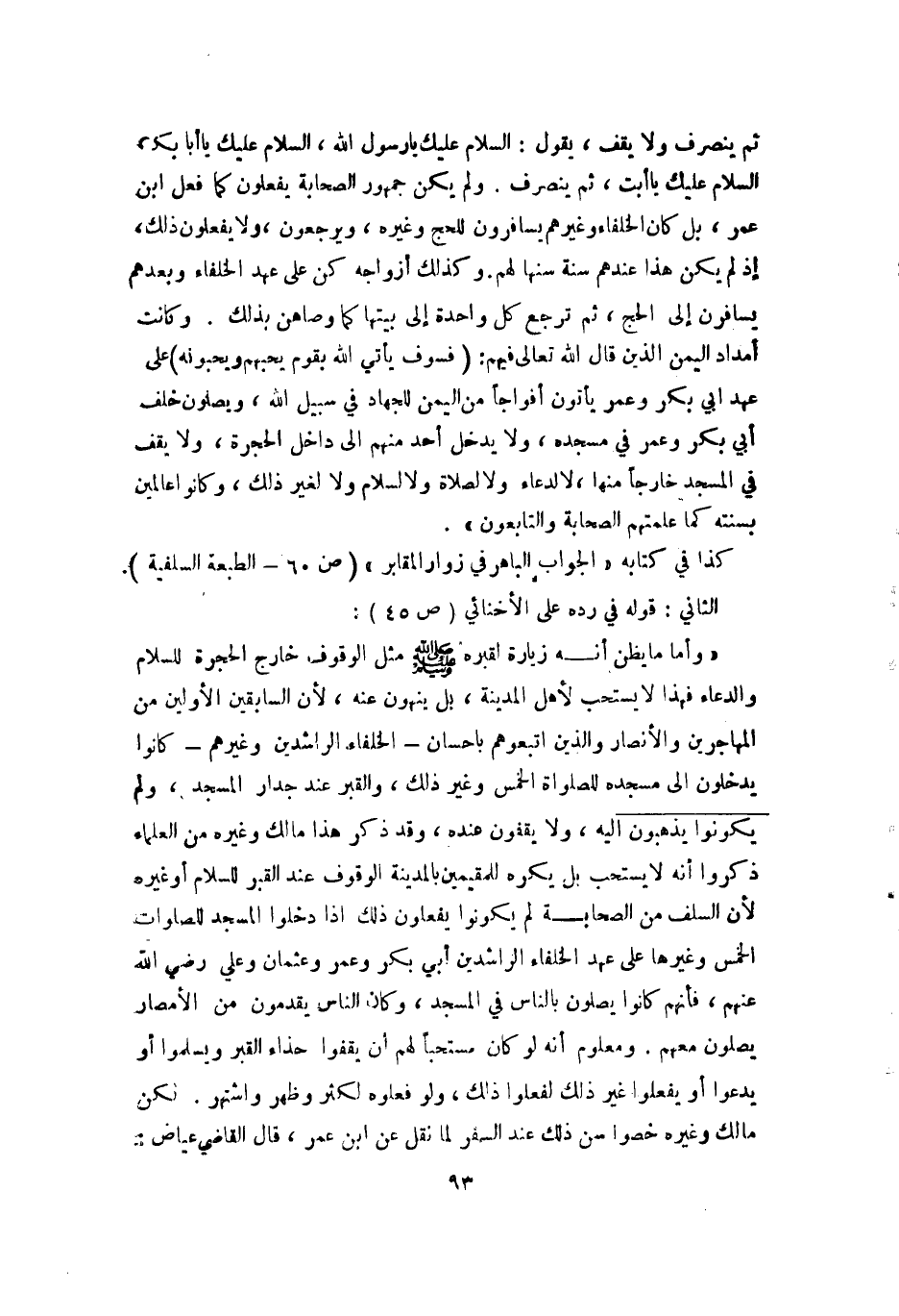 الثاني: قوله في رده على الأخنائي (ص 45) : (وأما ما يظن أنه زيارة لقبره A مثل الوقوف خارج الحجرة للسلام والدعاء فهذا لا يستحب لأهل المدينة بل ينهون عنه لأن السابقين الأولين من المهاجرين والأنصار والذين اتبعوهم بإحسان - الخلفاء الراشدين وغيرهم - كانوا يدخلون إلى مسجده للصلواة الخمس وغير ذلك والقبر عند جدار المسجد ولم يكونوا يذهبون إليه ولا يقفون عنده وقد ذكر هذا مالك وغيره من العلماء ذكروا أنه لا يستحب بل يكره للمقيمين بالمدينة الوقوف عند القبر للسلام أو غيره لأن السلف الصالح لم يكونوا يفعلون ذلك إذا دخلوا المسجد للصلوات الخمس وغيرها على عهد الخلفاء الراشدين أبي بكر وعمر وعثمان وعلي Bهم فإنهم كانوا يصلون بالناس في المسجد وكان الناس يقدمون من الأمصار يصلون معهم. ومعلوم أنه لو كان مستحبا لهم أن يقفوا حذاء القبر ويسلموا أو يدعوا أو يفعلوا غير ذلك لفعلوا ذلك ولو فعلوه لكثر وظهر واشتهر. لكن مالك وغيره خصوا سن ذلك عند السفر لما نقل عن ابن عمر قال القاضي عياض: