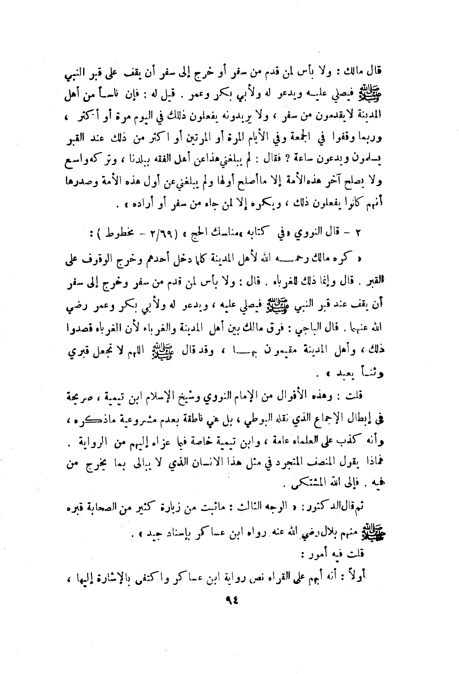2 - قال النووي في كتابه (مناسك الحج) (69 / 2 - مخطوط) : (كره مالك C لأهل المدينة كلما دخل أحدهم وخرج الوقوف على القبر. قال وإنما ذلك للغرباء. قال: ولا بأس لمن قدم من سفر وخرج إلى سفر أن يقف عند قبر النبي A فيصلي عليه ويدعو له ولأبي بكر وعمر Bهما. قال الباجي: فرق مالك بين أهل المدينة والغرباء لأن الغرباء قصدوا ذلك وأهل المدينة مقيمون بها وقد قال A اللهم لا تجعل قبري وثنا يعبد)