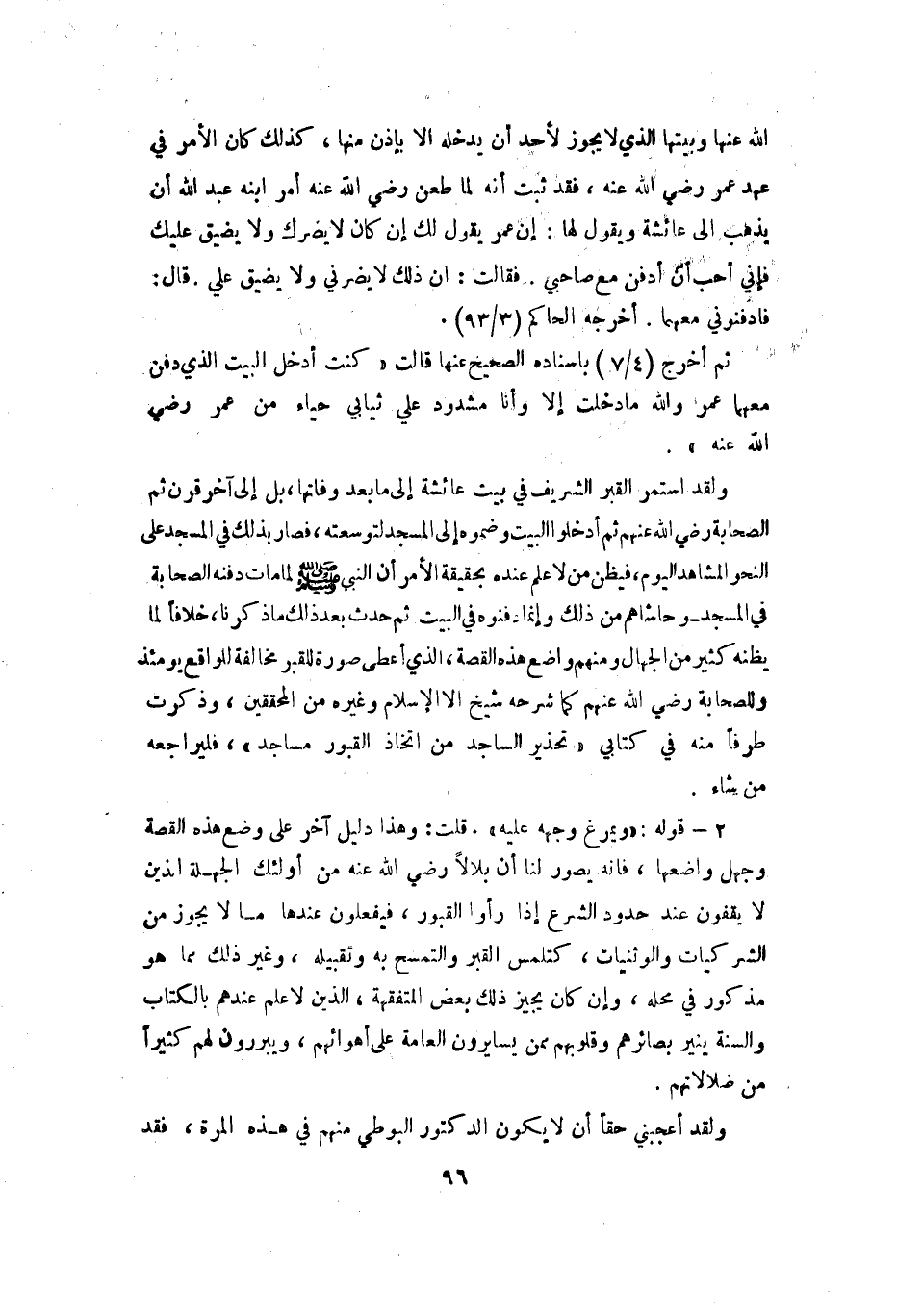2 - قوله: (ويمرغ وجهه عليه) . قلت: وهذا دليل آخر على وضع هذه القصة وجهل واضعها فإنه يصور لنا بلالا Bهـ من أولئك الجهلة الذين لا يقفون عند حدود الشرع إذا رأوا القبور فيفعلون عندها ما لا يجوز من الشركيات والوثنيات كتلمس القبر والتمسح به وتقبيله وغير ذلك مما هو مذكور في محله وإن كان يجيز ذلك بعض المتفقهة الذين لا علم عندهم بالكتاب والسنة ينير بصائرهم وقلوبهم ممن يسايرون العامة على أهوائهم ويبررون لهم كثيرا من ضلالاتهم