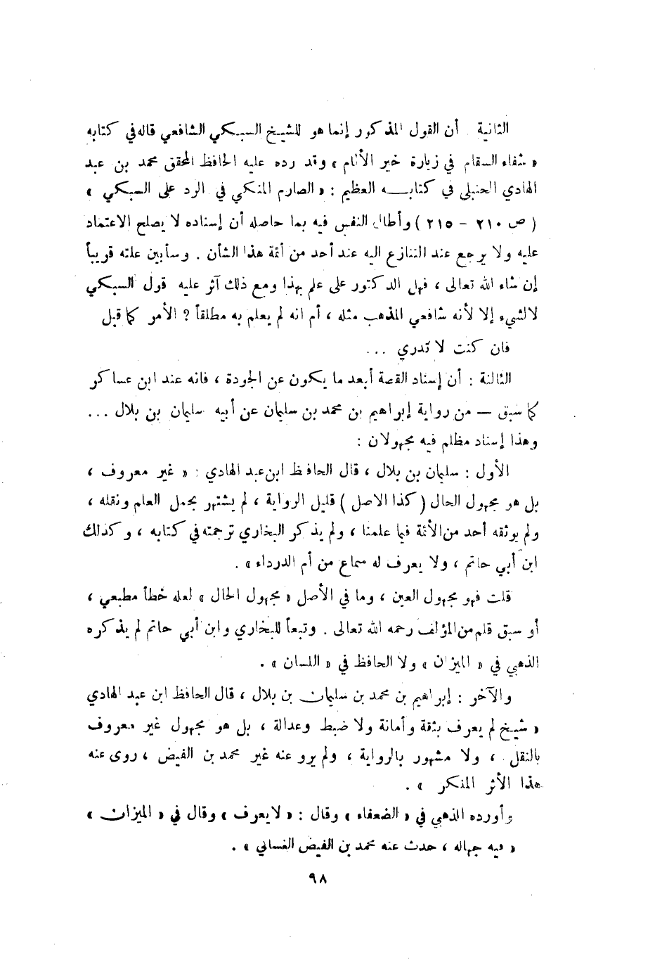 الثانية: أن القول المذكور إنما هو للشيخ السبكي الشافعي قاله في كتابه (شفاء السقام في زيارة خير الأنام) وقد رده الحافظ المحقق محمد بن عبد الهادي الحنبلي في كتابه العظيم: (الصارم المنكي في الرد على السبكي) (ص 210 - 215) وأطال النفس فيه بما حاصله أن إسناده لا يصلح الاعتماد عليه ولا يرجع عند التنازع إليه عند أحد من أئمة هذا الشأن. وسأبين علته قريبا إن شاء الله تعالى فهل الدكتور على علم بهذا ومع ذلك آثر عليه قول السبكي لا لشيء إلا لأنه شافعي المذهب مثله أم أنه لم يعلم به مطلقا؟ الأمر كما قيل:
