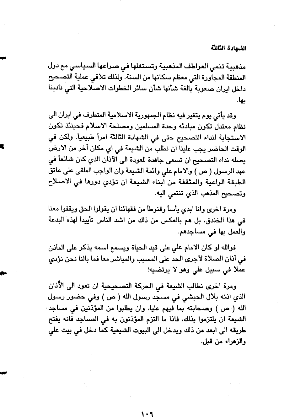 مذهبية تنمي العواطف المذهبية وتستغلها في صراعها السياسي مع دول المنطقة المجاورة التي معظم سكانها من السنة ولذلك تلاقي عملية التصحيح داخل إيران صعوبة بالغة شانها شأن سائر الخطوات الإصلاحية التي نادينا بها، وقد يأتي يوم يتغير فيه نظام الجمهورية الإسلامية المتطرف في إيران إلى نظام معتدل تكون مبادئه وحدة المسلمين ومصلحة الإسلام فحينئذ تكون الاستجابة لنداء التصحيح حتى في الشهادة الثالثة أمراً طبيعياَن ولكن في الوقت الحاضر يجب علينا أن نطلب من الشيعة في أي مكان آخر من الأرض يصله نداء التصحيح أن تسعى جاهدة للعودة إلى الأذان الذي كان شائعاً في عهد الرسول - صلى الله تعالى عليه وآله وسلم - والإمام " علي " وأئمة الشيعة وإن الواجب الملقى على عاتق الطبقة الواعية والمثقفة من أبناء الشيعة أن تؤدي دورها في الإصلاح وتصحيح المذهب الذي تنتمي إليه، ومرةً أخرى وأنا أبدي يأساً وقنوطاً من فقهائنا أن يقولوا الحق ويقفوا معنا في هذا الخندق بل هم على العكس من ذلك من أشد الناس تأييداً لهذه البدعة والعمل بها في مساجدهم، فوالله لو كان الإمام " علي " على قيد الحياة ويسمع اسمه يذكر على المآذن في أذان الصلاة لأجرى الحد على المسبب والمباشر معاً فما بالنا نحن نؤدي عملاً في سبيل " علي " وهو لا يرتضيه!!!!!!!!