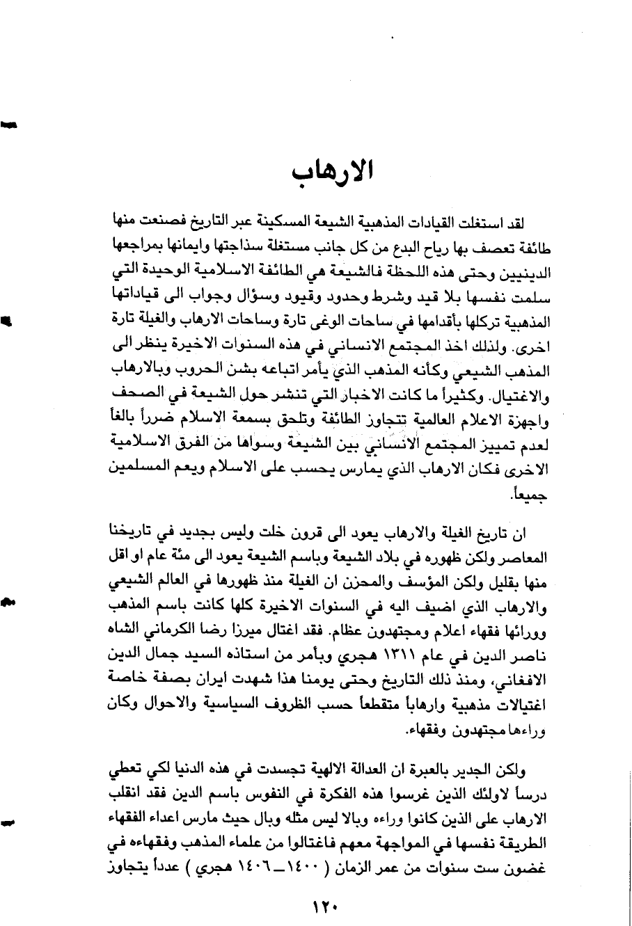 إن تاريخ الغيلة والإرهاب يعود إلى قرون خلت وليس بجديد في تاريخنا المعاصر ولكن ظهوره في بلاد الشيعة وباسم الشيعة يعود إلى مئة عام أو أقل منها بقليل ولكن المؤسف والمحزن أن الغيلة منذ ظهورها في العالم الشيعي والإرهاب الذي أضيف إليه في السنوات الأخيرة كلها كانت باسم المذهب ووراءها فقهاء أعلام ومجتهدون عظام فقد اغتال " ميرزا رضا الكرماني " الشاه " ناصر الدين " في عام 1311 هجري وبأمر من أستاذه السيد " جمال الدين الأفغاني " ومنذ ذلك التاريخ وحتى يومنا هذا شهدت إيران بصفة خاصة اغتيالات مذهبية وإرهاباً متقطعاً حسب الظروف السياسية والأحوال وكان وراءها مجتهدون وفقهاء، ولكن الجدير بالعبرة أن العدالة الإلهية تجسدت في هذه الدنيا لكي تعطي درساً لأولئك الذين غرسوا هذه الفكرة في النفوس باسم الدين فقد انقلب الإرهاب على الذين كانوا وراءه وبالاً ليس مثله وبال حيث مارس أعداء الفقهاء الطريقة نفسها في المواجهة معهم فاغتالوا من علماء المذهب وفقهاءه في غضون ست سنوات من عمر الزمان (1400 - 1406) هجري عدداً يتجاوز