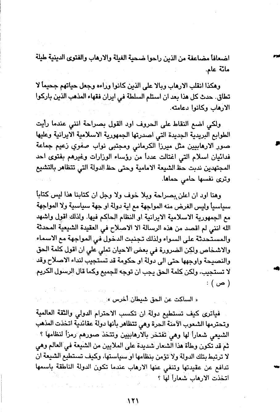 ولكي أضع النقاط على الحروف أود القول بصراحة: إنني عندما رأيت الطوابع البريدية الجديدة التي أصدرتها الجمهورية الإسلامية الإيرانية وعليها صور الإرهابيين مثل " ميرزا الكرماني " و " مجتبى نواب صفوي " زعيم جماعة ?فدائيان. إسلام? التي اغتالت عدداً من رؤساء الوزارات وغيرهم بفتوى أحد المجتهدين ندبت حظ الشيعة الإمامية وحتى حظ الدولة التي تتظاهر بالتشيع وترى نفسها حامي حماها، وهنا أود أن أعلن بصراحة وبلا خوف ولا وجل أن كتابنا هذا ليس كتاباً سياسياً وليس الغرض منه المواجهة مع أية دولة أو جهة سياسية ولا المواجهة مع الجمهورية الإسلامية الإيرانية أو النظام الحاكم فيها، ولذلك أقول وأشهد الله أنني لم أقصد من هذه الرسالة إلا الإصلاح في العقيدة الشيعية المحدثة والمستحدثة على السواء ولذلك تجنبت الدخول في المواجهة مع الأسماء والأشخاص ولكن الضرورة في بعض الأحيان تملي عليَّ أن أقول كلمة الحق والنصيحة وأوجهها حتى إلى دولة أو حكومة قد تستجيب لنداء الإصلاح وقد لا تستجيب ولكن كلمة الحق يجب أن توجه للجميع وكما قال الرسول الكريم: ?الساكت عن الحق شيطان أخرس? فيا ترى كيف تستطيع دولة أن تكسب الاحترام الدولي والثقة العالمية وتحترمها الشعوب الآمنة الحرة وهي تتظاهر بأنها دولة عقائدية اتخذت المذهب الشيعي شعاراً لها وهي تفتخر بالإرهابيين وتتخذ صورهم رمزاً لنظامها؟ ثم قد تكون وطأة هذا الشعار شديدة على الملايين من الشيعة في العالم وهي لا ترتبط بتلك الدولة ولا تؤمن بنظامها أو سياستها وكيف تستطيع الشيعة أن تدافع عن عقيدتها وتنفي عنها الإرهاب عندما تكون الدولة الناطقة باسمها اتخذت الإرهاب شعاراً لها؟