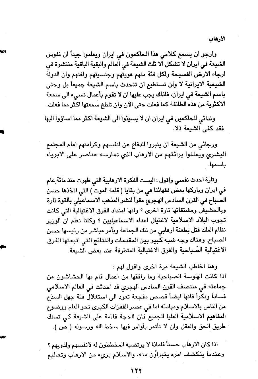 ورجائي من الشيعة أن ينبروا للدفاع عن أنفسهم وكرامتهم أمام المجتمع البشري ويعلنوا براءتهم من الإرهاب الذي تمارسه عناصر على الأبرياء باسمها، وتارةً أحدث نفسي وأقول: أليست الفكرة الإرهابية التي ظهرت منذ مئة عام في إيران وباركها بعض فقهائنا هي من بقايا (قلعة الموت) التي اتخذها " حسن الصباح " في القرن السادس الهجري مقراً لنشر المذهب الإسماعيلي بالقوة تارةً وبالحشيش ومشتقاتها تارةً أخرى؟ وإنها امتداد للفرق الاغتيالية التي كانت تجوب البلاد الإسلامية لاغتيال أعداء الإسماعيليين، وكلنا نعلم أن الوزير " نظام الملك " قتل بطعنة إرهابي من تلك الجماعة وبأمر مباشر من رئيسها " حسن الصباح " وهناك وجه شبه كبير بين المقدمات والنتائج التي اتبعتها الفرق الاغتيالية الصباحية والفرق الاغتيالية المتطرفة عند بعض الشيعة، وهنا أخاطب الشيعة مرةً أخرى وأقول لهم: إذا كانت الهلوسة الصباحية وما رافقها من أعمال قام بها الحشاشون من جماعته في منتصف القرن السادس الهجري قد أحدثت في العالم الإسلامي فساداً ونكراً فإنها أيضاً قصص مفجعة تعود إلى استغلال فئة جهل السذج من الناس بالإسلام ومبادئه أما في عصر القفزات الكبرى نحو العلم ووضوح المفاهيم الإسلامية العليا للجميع فإن الحجة قائمة على الشيعة كي تسلك طريق الحق والعقل وأن لا تأتمر بأوامر فيها سخط الله ورسوله صلى الله تعالى عليه وآله وسلم.