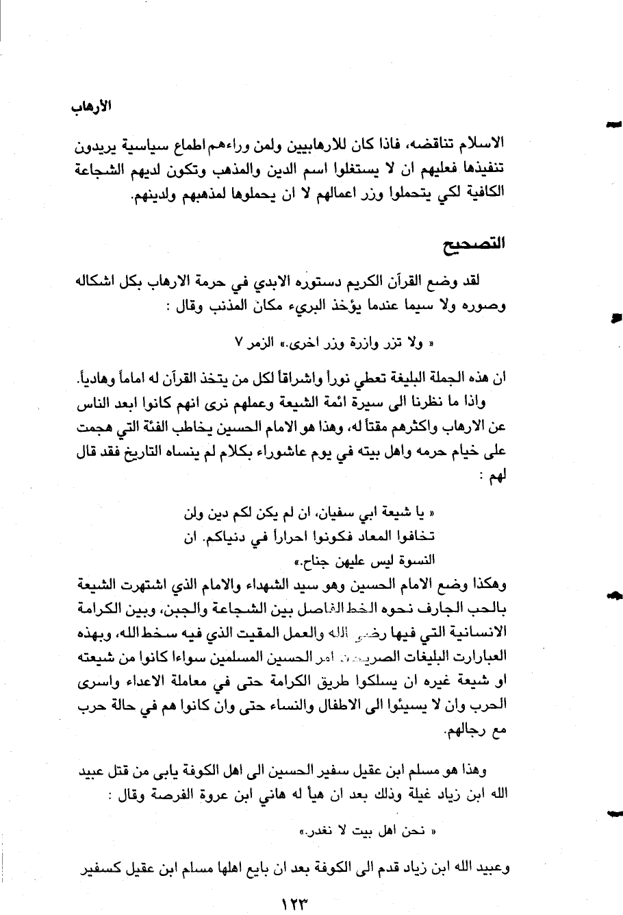 لقد وضع القرآن الكريم دستوره الأبدي في حرمة الإرهاب بكل أشكاله وصوره ولا سيما عندما يؤخذ البريء مكان المذنب وقال: ?ولا تزر وازرة وزر أخرى (¬1) .... ? إن هذه الجملة البليغة تعطي نوراً وإشراقاً لكل من يتخذ القرآن له إماماً وهادياً، وإذا ما نظرنا إلى سيرة أئمة الشيعة وعملهم نرى أنهم كانوا أبعد الناس عن الإرهاب وأكثرهم مقتاً له، وهذا هو الإمام " الحسين " يخاطب الفئة التي هجمت على خيام حرمه وأهل بيته في يوم عاشوراء بكلام لم ينساه التاريخ فقد قال لهم: ?يا شيعة أبي سفيان إن لم يكن لكم دين ولن تخافوا المعاد فكونوا أحراراً في دنياكم إن النسوة ليس عليهن جناح .. ? وهكذا وضع الإمام " الحسين " - وهو سيد الشهداء والإمام الذي اشتهرت الشيعة بالحب الجارف نحوه - الخط الفاصل بين الشجاعة والجبن وبين الكرامة الإنسانية التي فيها رضا الله والعمل المقيت الذي فيه سخط الله وبهذه العبارات البليغات الصريحات أمر " الحسين " المسلمين سواء كانوا من شيعته أو شيعة غيره أن يسلكوا طريق الكرامة حتى في معاملة الأعداء وأسرى الحرب وأن لا يسيئوا إلى الأطفال والنساء حتى وإن كانوا هم في حالة حرب مع رجالهم، وهذا هو " مسلم بن عقيل " سفير " الحسين " إلى أهل " الكوفة " يأبى من قتل " عبيد الله بن زياد " غيلة وذلك بعد أن هيأ له " هانئ بن عروة " الفرصة وقال: (نحن أهل بيت لا نغدر) و " عبيد الله بن زياد " قدم إلى الكوفة بعد أن بايع أهلها " مسلم بن عقيل " كسفير "
