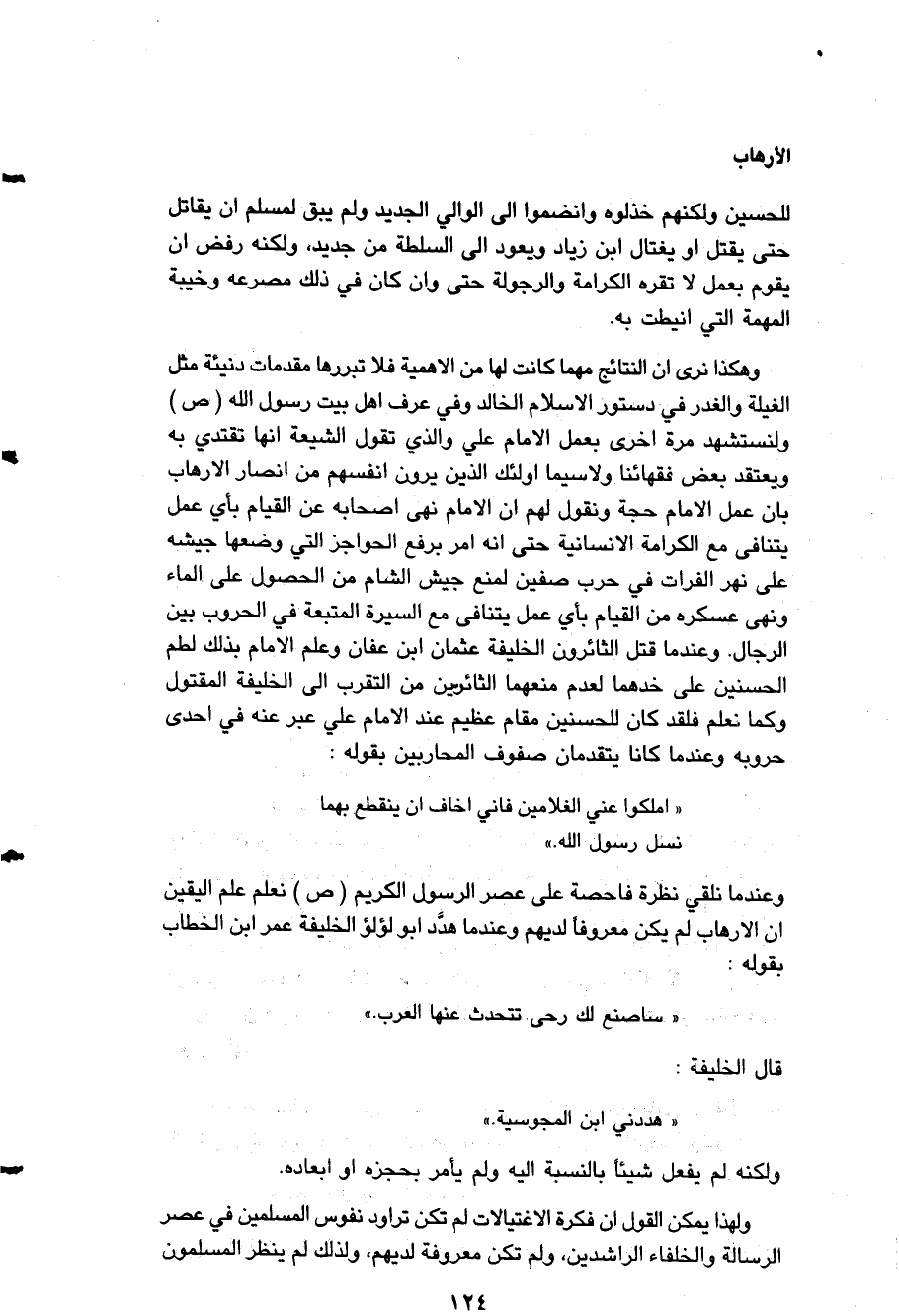 ولنستشهد مرةً أخرى بعمل الإمام " علي " والذي تقول الشيعة إناه تقتدي به ويعتقد بعض فقهائنا ولا سيما أولئك الذين يرون أنفسهم من أنصار الإرهاب بأن عمل الإمام حجة ونقول لهم: إن الإمام نهى أصحابه عن القيام بأي عمل يتنافى مع الكرامة الإنسانية حتى أنه أمر برفع الحواجز التي وضعها جيشه على نهر الفرات في حرب " صفين " لمنع جيش " الشام " من الحصول على الماء ونهى عسكره من القيام بأي عمل يتنافى مع السيرة المتبعة في الحروب بين الرجال، وعندما قتل الثائرون الخليفة " عثمان ابن عفان " وعلم الإمام بذلك لطم " الحسنين " على خدهما لعدم منعهما الثائرين من التقرب إلى الخليفة المقتول وكما نعلم كان " للحسنين " مقام عظيم عند الإمام " علي " عبر عنه في إحدى حروبه وعندما كانا يتقدمان صفوف المحاربين بقوله: ?املكوا عني الغلامين فإني أخاف أن ينقطع بهما نسل رسول الله? وعندما نلقي نظرة فاحصة على عصر الرسول الكريم - صلى الله تعالى عليه وآله وسلم - نعلم علم اليقين أن الإرهاب لم يكن معروفاً لديهم وعندما هدّد " أبو لؤلؤة " الخليفة " عمر بن الخطاب " بقوله: (سأصنع لك رحى تحدث عنها العرب) قال الخليفة: ?هددني ابن المجوسية? ولكنه لم يفعل شيئاً بالنسبة إليه ولم يأمر بحجزه أو إبعاده، ولهذا يمكن القول: إن فكرة الاغتيالات لم تكن تراود نفوس المسلمين في عصر الرسالة والخلفاء الراشدين ولم تكن معروفة لديهم ولذلك لم ينظر المسلمون