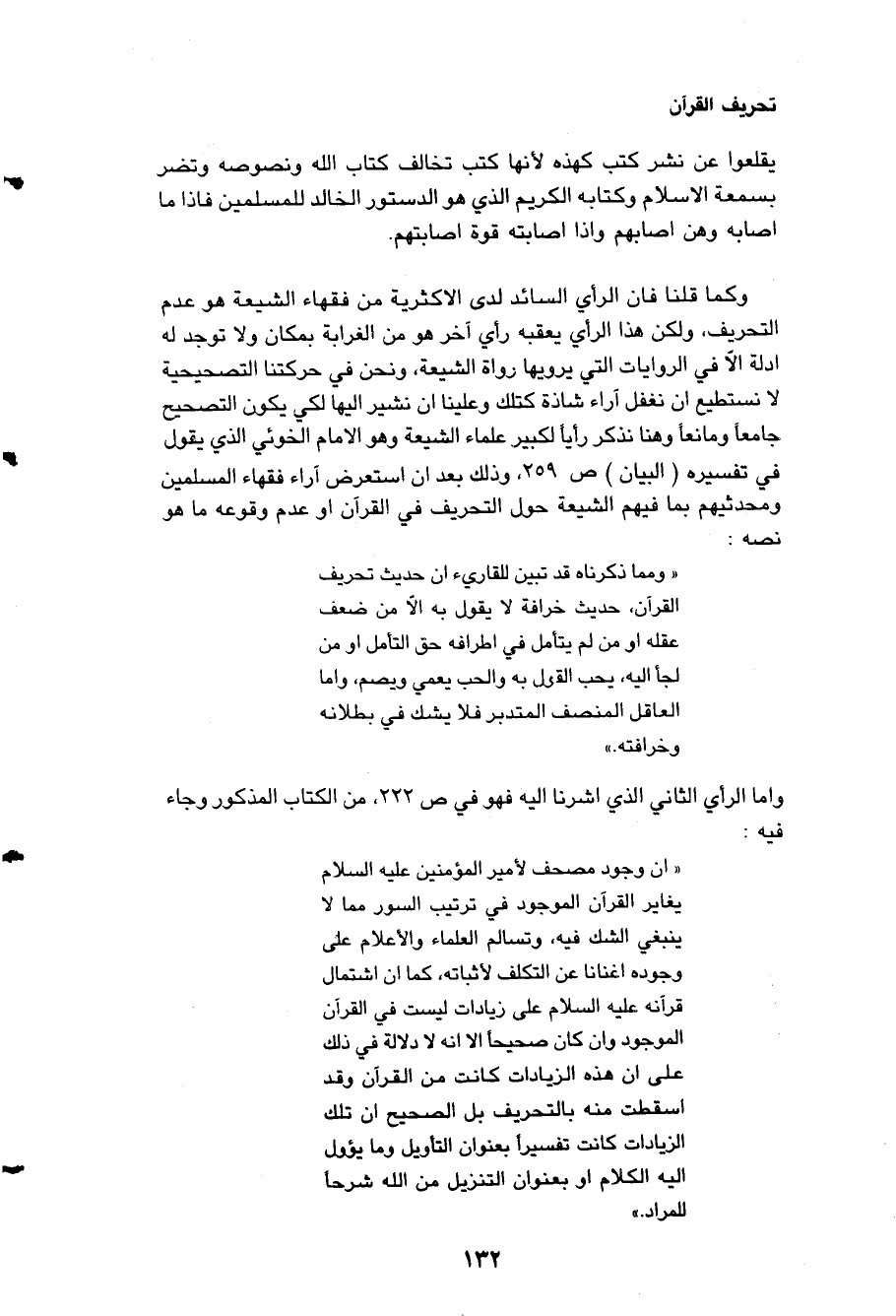 وكما قلنا فإن الرأي السائد لدى الأكثرية من فقهاء الشيعة هو عدم التحريف، ولكن هذا الرأي يعقبه رأي آخر هو من الغرابة بمكان ولا توجد له أدلة إلا في الروايات التي يرويها رواة الشيعة، ونحن في حركتنا التصحيحية لا نستطيع أن نغفل آراءً شاذّة كتلك وعلينا أن نشير إليها لكي يكون التصحيح جامعاً ومانعاً نذكر رأياً لكبير علماء الشيعة وهو الإمام " الخوئي " الذي يقول في تفسيره " البيان " ص259 وذلك بعد أن استعرض آراء فقهاء المسلمين ومحدثيهم بما فيهم الشيعة حول التحريف في القرآن أو عدم وقوعه ما هو نصه: (ومما ذكرناه قد تبين للقارئ أن حديث تحريف القرآن حديث خرافة لا يقول به إلا من ضعف عقله أو من لم يتأمل في أطرافه حق التأمل أو من لجأ إليه، يحب القول به والحب يعمي ويصم وأما العاقل المنصف المتدبر فلا يشك في بطلانه وخرافته). وأما الرأي الثاني الذي أشرنا إليه فهو في ص222 من الكتاب المذكور وجاء فيه: (إن وجود مصحف لأمير المؤمنين عليه السلام يغاير القرآن الموجود في ترتيب السور مما لا ينبغي الشك فيه وتسالم العلماء والأعلام على وجوده أغنانا عن التكلف لإثباته كما أن اشتمال قرآنه عليه السلام على زيادات ليست في القرآن الموجود وإن كان صحيحاً إلا أنه لا دلالة في ذلك على أن هذه الزيادات كانت من القرآن وقد أسقطت منه بالتحريف بل الصحيح أن تلك الزيادات كانت تفسيراً بعنوان التأويل وما يؤول إليه الكلام أو بعنوان التنزيل من الله شرحاً للمراد)
