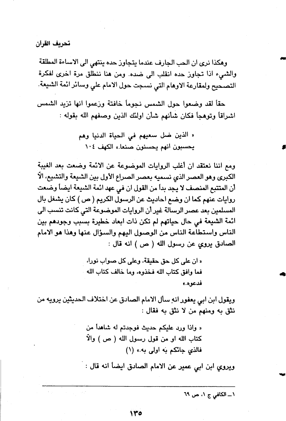 وهكذا نرى أن الحب الجارف عندما يتجاوز حده ينتهي إلى الإساءة المطلقة والشيء إذا تجاوز حده انقلب إلى ضده ومن هنا نطلق مرةً أخرى لفكرة التصحيح ولمقارعة الأوهام التي نسجت حول الإمام " علي " وسائر أئمة الشيعة، حقاً لقد وضعوا حول الشمس نجوماً خافتة وزعموا أنها تزيد الشمس إشراقاً وتوهجاً فكان شأنهم شأن أولئك الذين وصفهم الله بقوله: ? الذين ضل سعيهم في الحياة الدنيا وهم يحسبون أنهم يحسنون صنعاً (¬1) .... ? ومع أننا نعتقد أن أغلب الروايات الموضوعة عن الأئمة وضعت بعد الغيبة الكبرى وهو العصر الذي نسميه بعصر الصراع الأول بين الشيعة والتشيع، إلا أن المتتبع المنصف لا يجد بداً من القول إن في عهد أئمة الشيعة أيضاً وضعت