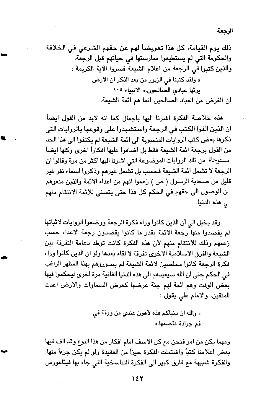وقد يخيل إليّ أن الذين كانوا وراء فكرة الرجعة ووضعوا هذه الروايات لإثباتها لم يقصدوا منها رجعة الأئمة بقدر ما كانوا يقصدون رجعة الأعداء حسب زعمهم وذلك للانتقام منهم لأن هذه الفكرة كانت توطد دعامة التفرقة بين الشيعة والفرق الإسلامية الأخرى تفرقة لا لقاء بعدها، ولو أن الذين كانوا وراء فكرة الرجعة كانوا مخلصين لأئمة الشيعة لم يصوروهم بهذا المظهر الراغب في الحكم حتى أن الله سيعيدهم إلى هذه الدنيا الفانية مرةً أخرى ليحكموا فيها بعض الوقت وهم أئمة لهم جنة عرضها كعرض السموات والأرض أعدت للمتقين، والإمام " علي " يقول: ? والله إن دنياكم هذه لأهون عندي من ورقة فم جرادة تقضمها ? ومهما يكن من أمر فنحن مع كل الأسف أمام أفكار من هذا النوع وقد ألف فيها بعض أعلامنا كتباً واشتملت الفكرة حيزاً من العقيدة ولو لم يكن جزءاً منها، والفكرة شبيهة مع فارق كبير إلى الفكرة التناسخية التي جاء بها " فيثاغورس "