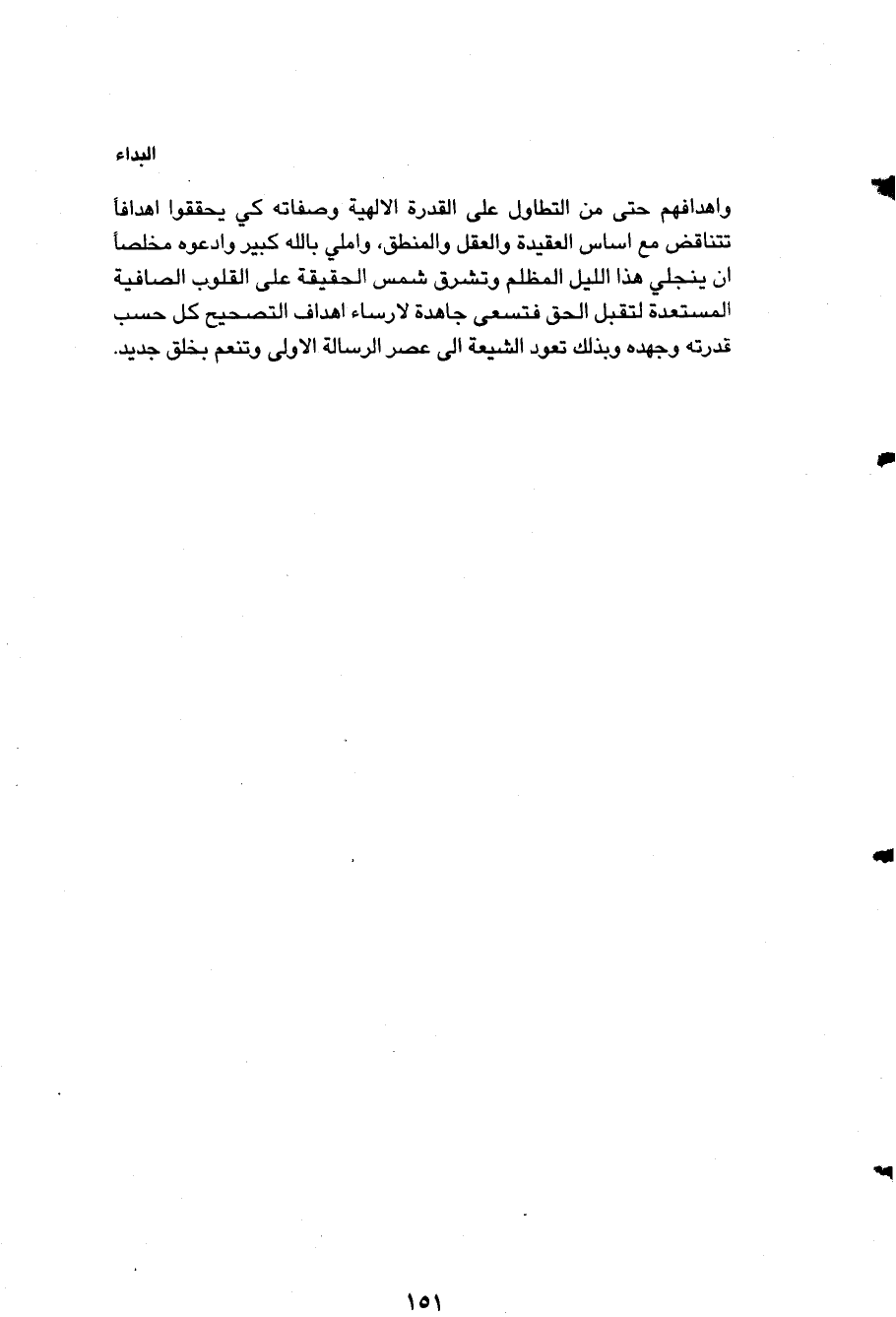 وأهدافهم حتى من التطاول على القدرة الإلهية وصفاته كي يحققوا أهدافاً تتناقض مع أساس العقيدة والعقل والمنطق وأملي بالله كبير وأدعوه مخلصاً أن ينجلي هذا الليل المظلم وتشرق شمس الحقيقة على القلوب الصافية المستعدة لتقبل الحق فتسعى جاهدةً لإرساء أهداف التصحيح كل حسب قدرته وجهده وبذلك تعود الشيعة إلى عصر الرسالة الأولى وتنعم بخلق جديد.