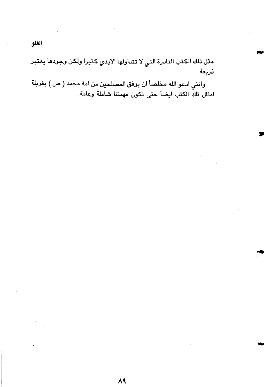 مثل تلك الكتب النادرة التي لا تتداولها الأيدي كثيراً ولكن وجودها يعتبر ذريعة، وإنني أدعو الله مخلصاً أن يوفق المصلحين من أمة محمد - صلى الله تعالى عليه وآله وسلم - بغربلة أمثال تلك الكتب أيضاً حتى تكون مهمتنا شاملة وعامّة.