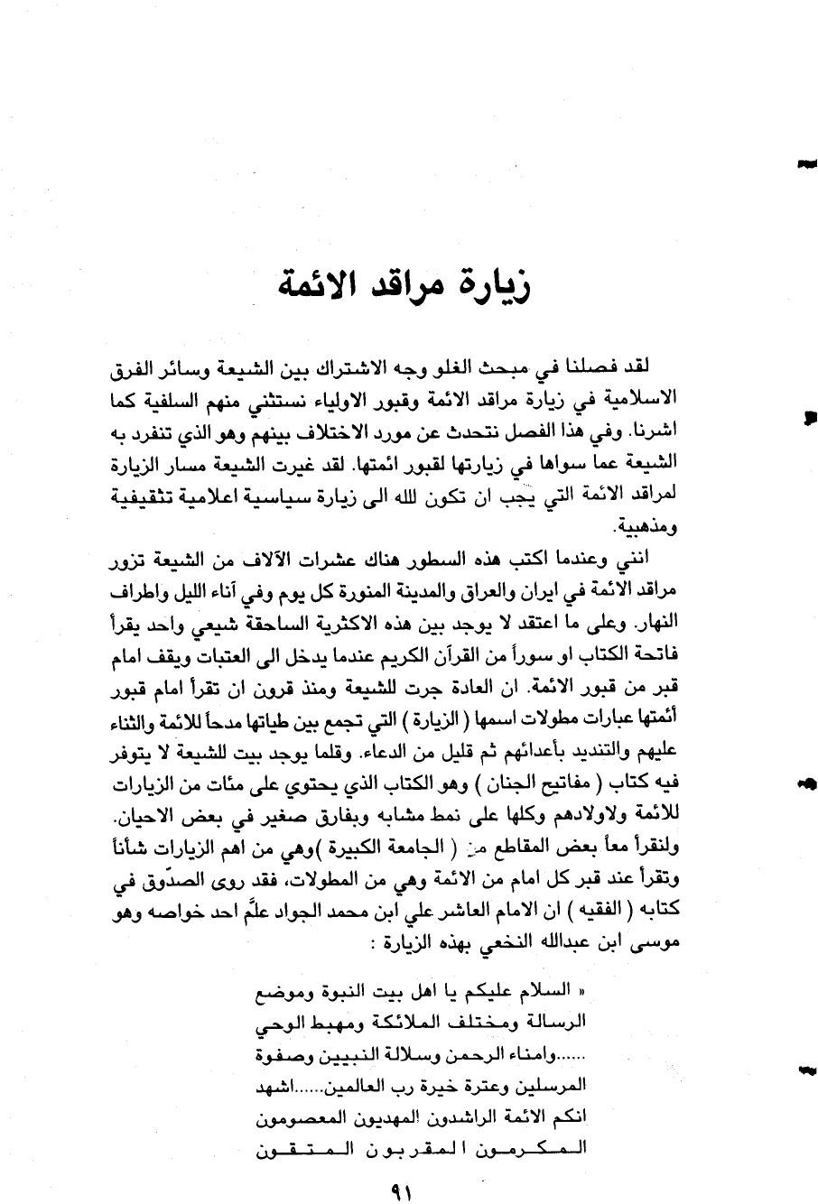 لقد فصلنا في مبحث الغلو وجه الاشتراك بين الشيعة وسائر الفرق الإسلامية في زيارة مراقد الأئمة وقبور الأولياء نستثني منهم السلفية كما أشرنا وفي هذا الفصل نتحدث عن مورد الاختلاف بينهم وهو الذي تنفرد به الشيعة عما سواها في زيارتها لقبور أئمتها، لقد غيرت الشيعة مسار الزيارة لمراقد الأئمة التي يجب أن تكون لله إلى زيارة سياسية إعلامية تثقيفية ومذهبية، إنني وعندما أكتب هذه السطور هناك عشرات الآلاف من الشيعة تزور مراقد الأئمة في إيران والعراق والمدينة المنورة كل يوم وفي آناء الليل وأطراف النهار، وعلى ما أعتقد لا يوجد بين هذه الأكثرية الساحقة شيعي واحد يقرأ فاتحة الكتاب أو سوراً من القرآن الكريم عندما يدخل إلى العتبات ويقف أمام قبر من قبور الأئمة، إن العادة جرت للشيعة ومنذ قرون أن تقرأ أمام قبور أئمتها عبارات مطولات اسمها (الزيارة) التي تجمع بين طياتها مدحاً للأئمة والثناء عليهم والتنديد بأعدائهم ثم قليل من الدعاء، وقلما يوجد بيت للشيعة لا يتوفر فيه كتاب?مفاتيح الجنان? وهو الكتاب الذي يحتوي على مئات من الزيارات للأئمة ولأولادهم وكلها على نمط مشابه وبفارق صغير في بعض الأحيان ولنقرأ معاً بعض المقاطع من ?الجامعة الكبيرة? وهي من أهم الزيارات شأناً وتقرأ عند قبر كل إمام من الأئمة وهي من المطولات، فقد روى " الصدّوق " في كتابه " الفقيه " أن الإمام العاشر " علي بن محمد الجواد " علّم أحد خواصه وهو " موسى بن عبد الله النخعي " بهذه الزيارة: ? السلام عليكم يا أهل بيت النبوة وموضع الرسالة ومختلف الملائكة ومهبط الوحي ....... وأمناء الرحمن وسلالة رب العالمين ........ أشهد أنكم الأئمة الراشدون المهديون المعصومون المكرمون المقربون المتقون