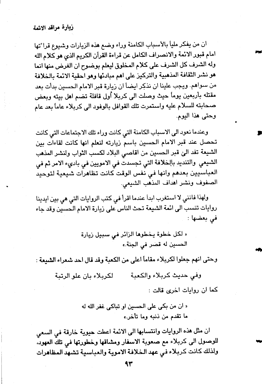 إن من يفكر ملياً بالأسباب الكامنة وراء وضع هذه الزيارات وشيوع قراءتها أمام قبور الأئمة والانصراف عن قراءة القرآن الكريم الذي هو كلام الله وله الشرف كل الشرف على كلام المخلوق ليعلم بوضوح أن الغرض منها إنما هو نشر الثقافة المذهبية والتركيز على أهم مبادئها وهو أحقيّة الأئمة بالخلافة من سواهم، ويجب علينا أن نذكر أيضاً أن زيارة قبر الإمام " الحسين " بدأت بعد مقتله بأربعين يوماً حيث وصلت إلى " كربلاء " أول قافلة تضم أهل بيته وبعض صحابته للسلام عليه واستمرت تلك القوافل بالوفود إلى " كربلاء " عاماً بعد عام وحتى هذا اليوم، وعندما نعود إلى الأسباب الكامنة التي كانت وراء تلك الاجتماعات التي كانت تحصل عند قبر الإمام " الحسين " من أقاصي البلاد لكسب الثواب ولنشر المذهب الشيعي والتنديد بالخلافة التي تجسدت في الأمويين في بادئ الأمر ثم في العباسيين بعدهم وأنها في نفس الوقت كانت تظاهرات شيعية لتوحيد الصفوف ونشر أهداف المذهب الشيعي، ولهذا فإنني لا أستغرب أبداً عندما أقرأ في كتب الروايات التي هي بين أيدينا روايات تنسب إلى أئمة الشيعة تحث الناس على زيارة الإمام " الحسين " وقد جاء في بعضها: ? لكل خطوة يخطوها الزائر في سبيل زيارة الحسين له قصر في الجنة ? وحتى أنهم جعلوا لكربلاء مقاماً أعلى من الكعبة وقد قال أحد شعراء الشيعة: