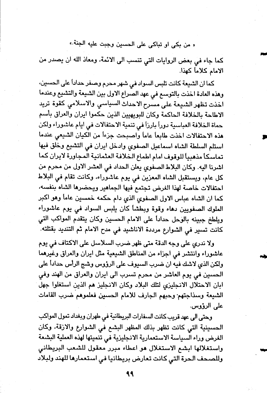 الرؤوس وشج الرأس حداداً على " الحسين " في يوم العاشر من محرم تسرب إلى إيران والعراق من الهند وفي إبان الاحتلال الإنجليزي لتلك البلاد وكان الإنجليز هم الذين استغلوا جهل الشيعة وسذاجتهم وحبهم الجارف للإمام " الحسين " فعلموهم ضرب القامات على الرؤوس، وحتى إلى عهد قريب كانت السفارات البريطانية في طهران وبغداد تمول المواكب الحسينية التي كانت تظهر بذلك المظهر البشع في الشوارع والأزقة وكان الغرض وراء السياسة الاستعمارية الإنجليزية في تنميتها لهذه العملية البشعة واستغلالها أبشع الاستغلال هو إعطاء مبرر معقول للشعب البريطاني وللصحف الحرة التي كانت تعارض بريطانيا في استعمارها للهند ولبلاد