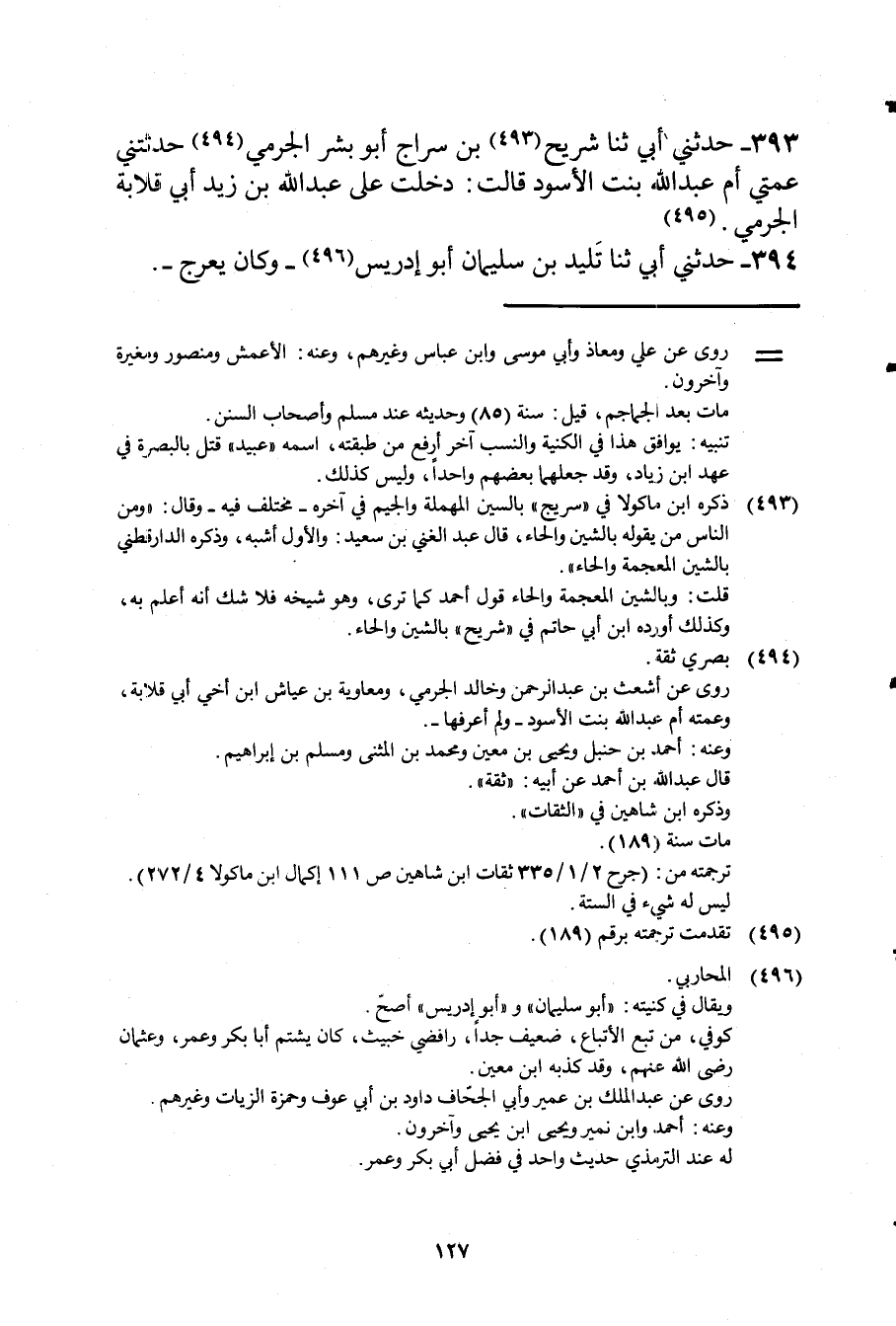 393 - حَدثنِي أبي ثَنَا شُرَيْح بن سراج أَبُو بشر الْجرْمِي حَدَّثتنِي عَمَّتي أم عبد الله بنت الْأسود قَالَت دخلت على عبد الله بن زيد أبي قلَابَة الْجرْمِي