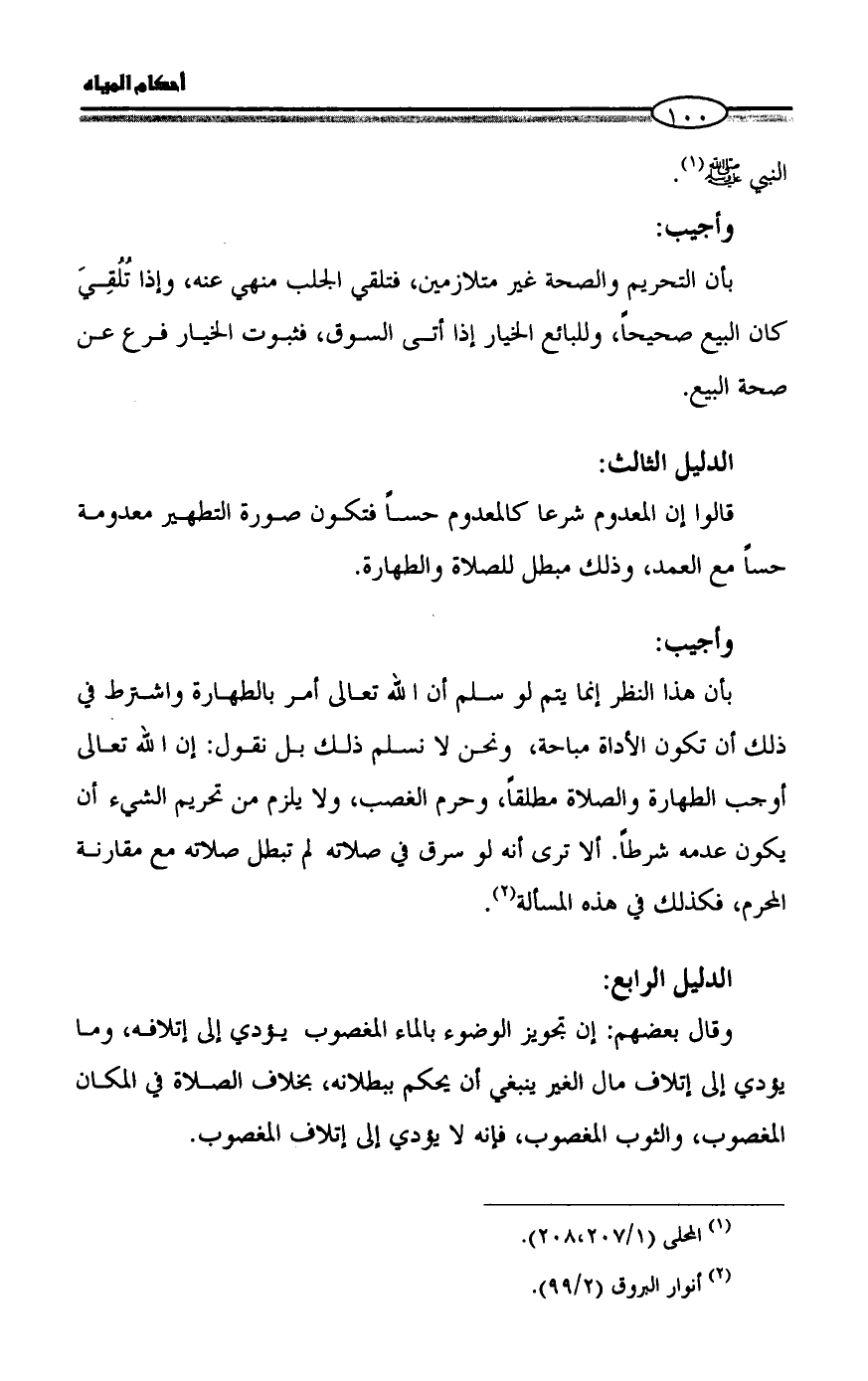 بأن هذا النظر إنما يتم لو سلم أن الله تعالى أمر بالطهارة واشترط في ذلك أن تكون الأداة مباحة، ونحن لا نسلم ذلك بل نقول: إن الله تعالى أوجب الطهارة والصلاة مطلقاً، وحرم الغصب، ولا يلزم من تحريم الشيء أن يكون عدمه شرطاً. ألا ترى أنه لو سرق في صلاته لم تبطل صلاته مع مقارنة المحرم، فكذلك في هذه المسألة (¬2).