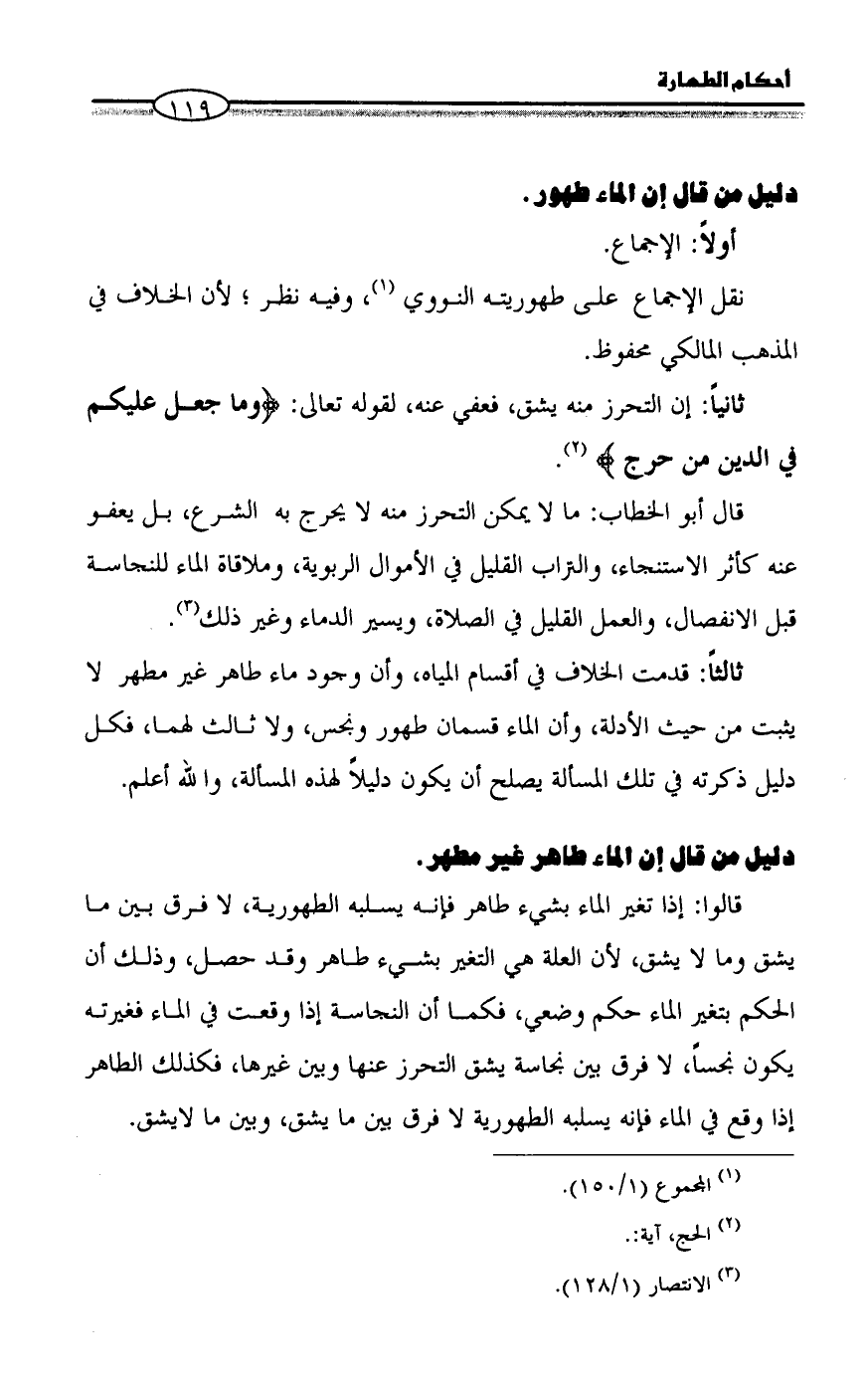 ثالثاً: قدمت الخلاف في أقسام المياه، وأن وجود ماء طاهر غير مطهر لا يثبت من حيث الأدلة، وأن الماء قسمان طهور ونجس، ولا ثالث لهما، فكل دليل ذكرته في تلك المسألة يصلح أن يكون دليلاً لهذه المسألة، والله أعلم.