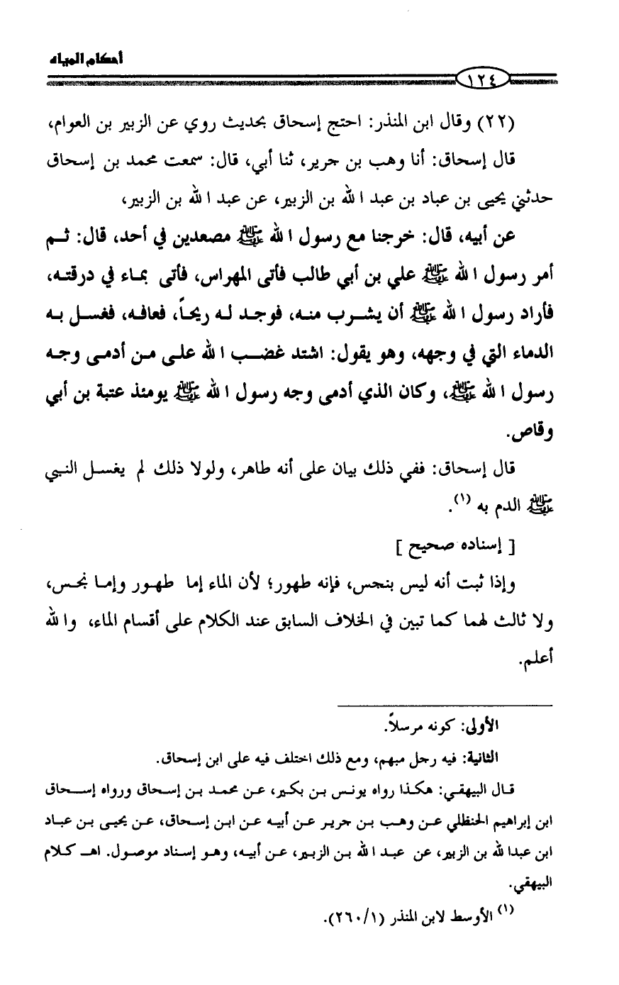 (22) وقال ابن المنذر: احتج إسحاق بحديث روي عن الزبير بن العوام، قال إسحاق: أنا وهب بن جرير، ثنا أبي، قال: سمعت محمد بن إسحاق حدثني يحيى بن عباد بن عبد الله بن الزبير، عن عبد الله بن الزبير،