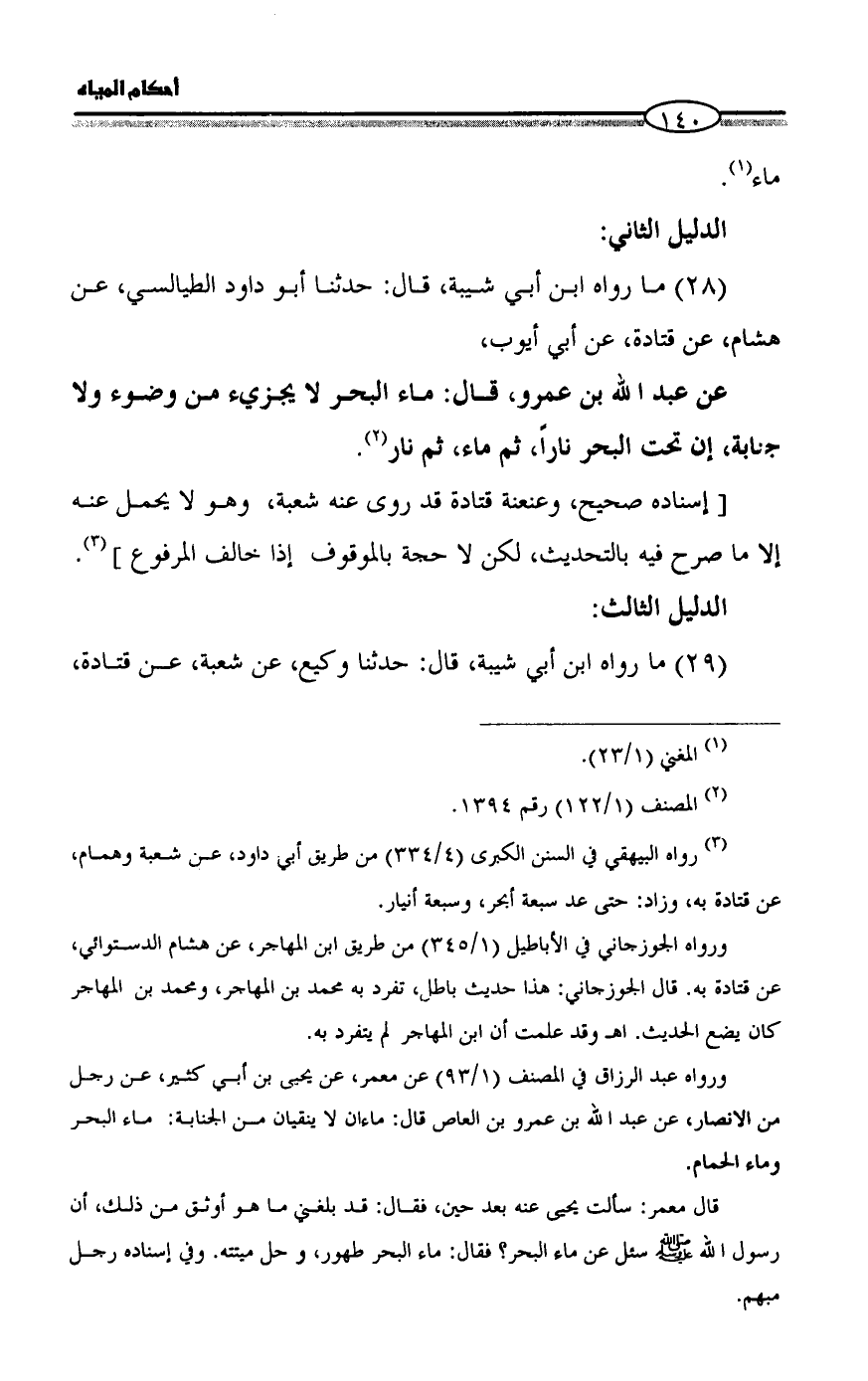 عن عبد الله بن عمرو، قال: ماء البحر لا يجزيء من وضوء ولا جنابة، إن تحت البحر ناراً، ثم ماء، ثم نار (¬2).