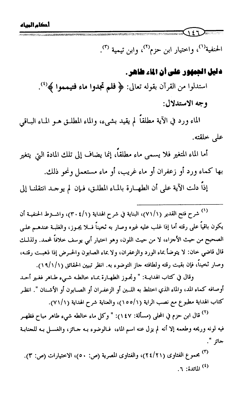 (¬2) قال ابن حزم في المحلى (مسألة: 147): " وكل ماء خالطه شيء طاهر مباح فظهر فيه لونه وريحه وطعمه إلا أنه لم يزل عنه اسم الماء، فالوضوء به جائز، والغسل به للجنابة جائز ".