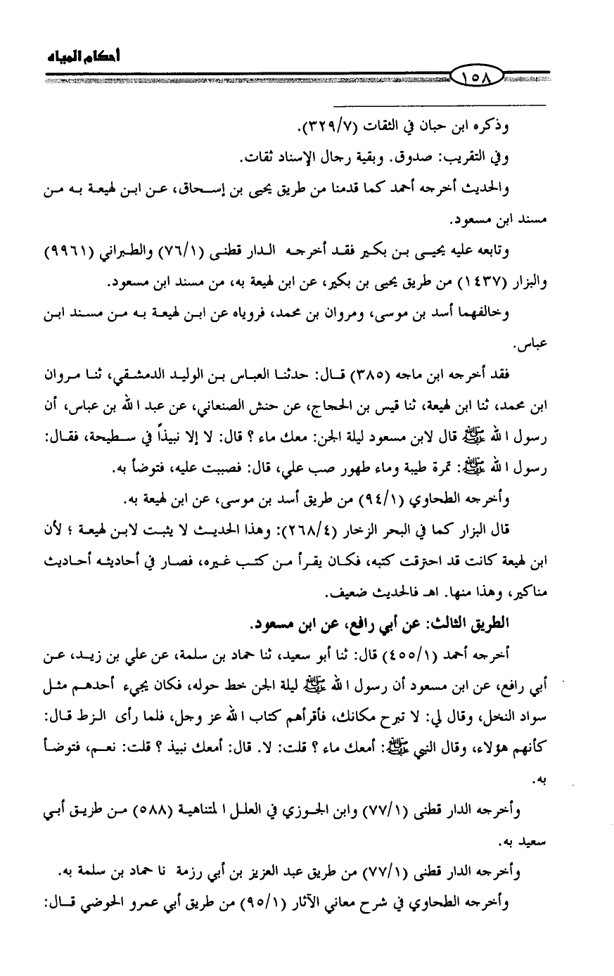 أخرجه أحمد (1/ 455) قال: ثنا أبو سعيد، ثنا حماد بن سلمة، عن علي بن زيد، عن أبي رافع، عن ابن مسعود أن رسول الله - صلى الله عليه وسلم - ليلة الجن خط حوله، فكان يجيء أحدهم مثل سواد النخل، وقال لي: لا تبرح مكانك، فأقرأهم كتاب الله عز وجل، فلما رأى الزط قال: كأنهم هؤلاء، وقال النبي - صلى الله عليه وسلم -: أمعك ماء؟ قلت: لا. قال: أمعك نبيذ؟ قلت: نعم، فتوضأ به.