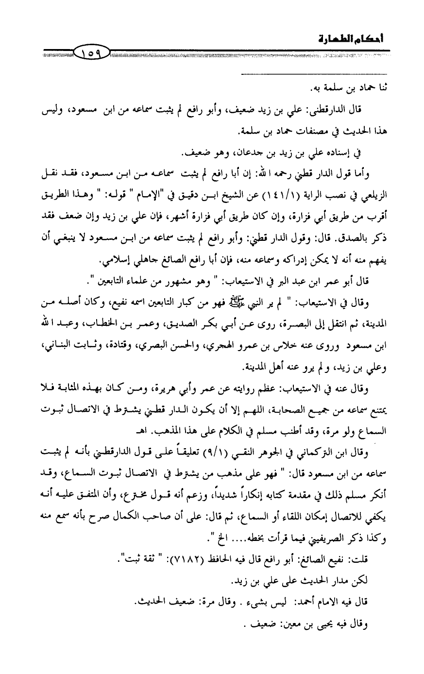 وأما قول الدارقطني رحمه الله: إن أبا رافع لم يثبت سماعه من ابن مسعود، فقد نقل الزيلعي في نصب الراية (1/ 141) عن الشيخ ابن دقيق في "الإمام " قوله: " وهذا الطريق أقرب من طريق أبي فزارة، وإن كان طريق أبي فزارة أشهر، فإن علي بن زيد وإن ضعف فقد ذكر بالصدق. قال: وقول الدارقطني: وأبو رافع لم يثبت سماعه من ابن مسعود لا ينبغي أن يفهم منه أنه لا يمكن إدراكه وسماعه منه، فإن أبا رافع الصائغ جاهلي إسلامي.