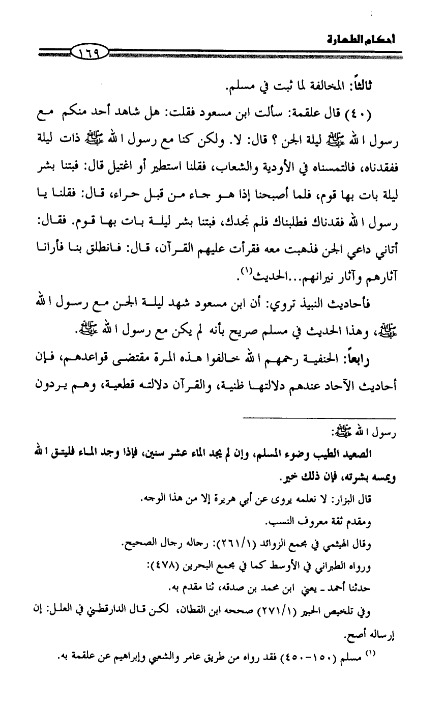 (40) قال علقمة: سألت ابن مسعود فقلت: هل شاهد أحد منكم مع رسول الله - صلى الله عليه وسلم - ليلة الجن؟ قال: لا. ولكن كنا مع رسول الله - صلى الله عليه وسلم - ذات ليلة ففقدناه، فالتمسناه في الأودية والشعاب، فقلنا استطير أو اغتيل قال: فبتنا بشر ليلة بات بها قوم، فلما أصبحنا إذا هو جاء من قبل حراء، قال: فقلنا يا رسول الله فقدناك فطلبناك فلم نجدك، فبتنا بشر ليلة بات بها قوم. فقال: أتاني داعي الجن فذهبت معه فقرأت عليهم القرآن، قال: فانطلق بنا فأرانا آثارهم وآثار نيرانهم ... الحديث (¬1).