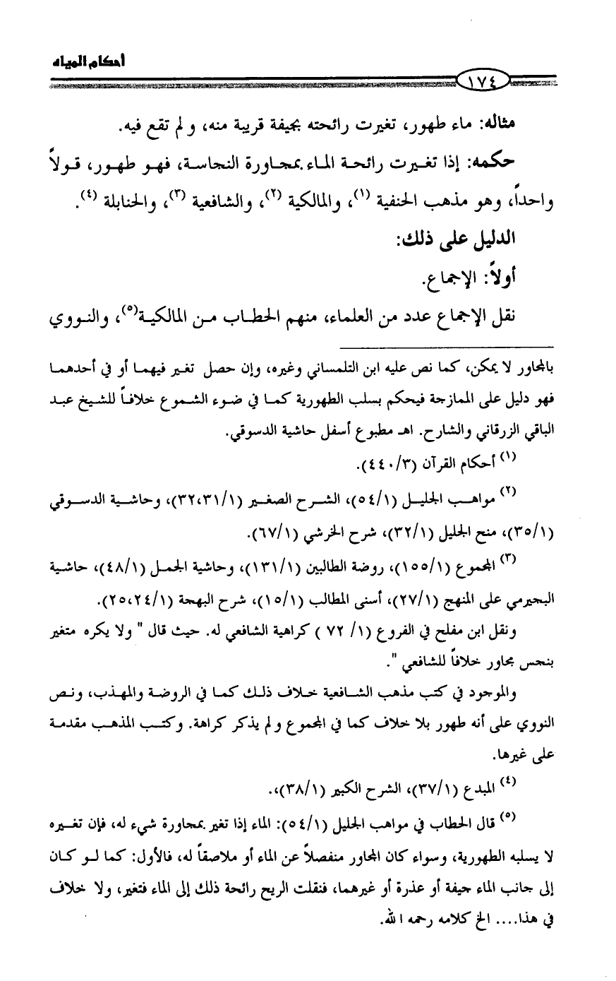 (¬5) قال الحطاب في مواهب الجليل (1/ 54): الماء إذا تغير بمجاورة شيء له، فإن تغيره لا يسلبه الطهورية، وسواء كان المجاور منفصلاً عن الماء أو ملاصقاً له، فالأول: كما لو كان إلى جانب الماء جيفة أو عذرة أو غيرهما، فنقلت الريح رائحة ذلك إلى الماء فتغير، ولا خلاف في هذا .... الخ كلامه رحمه الله.