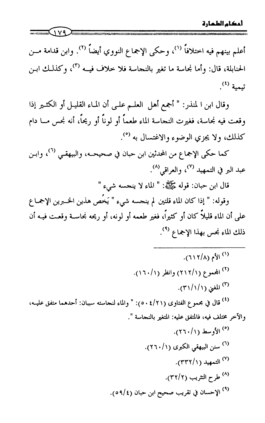 (¬4) قال في مجموع الفتاوى (21/ 504): " والماء لنجاسته سببان: أحدهما متفق عليه، والآخر مختلف فيه، فالمتفق عليه: المتغير بالنجاسة ".