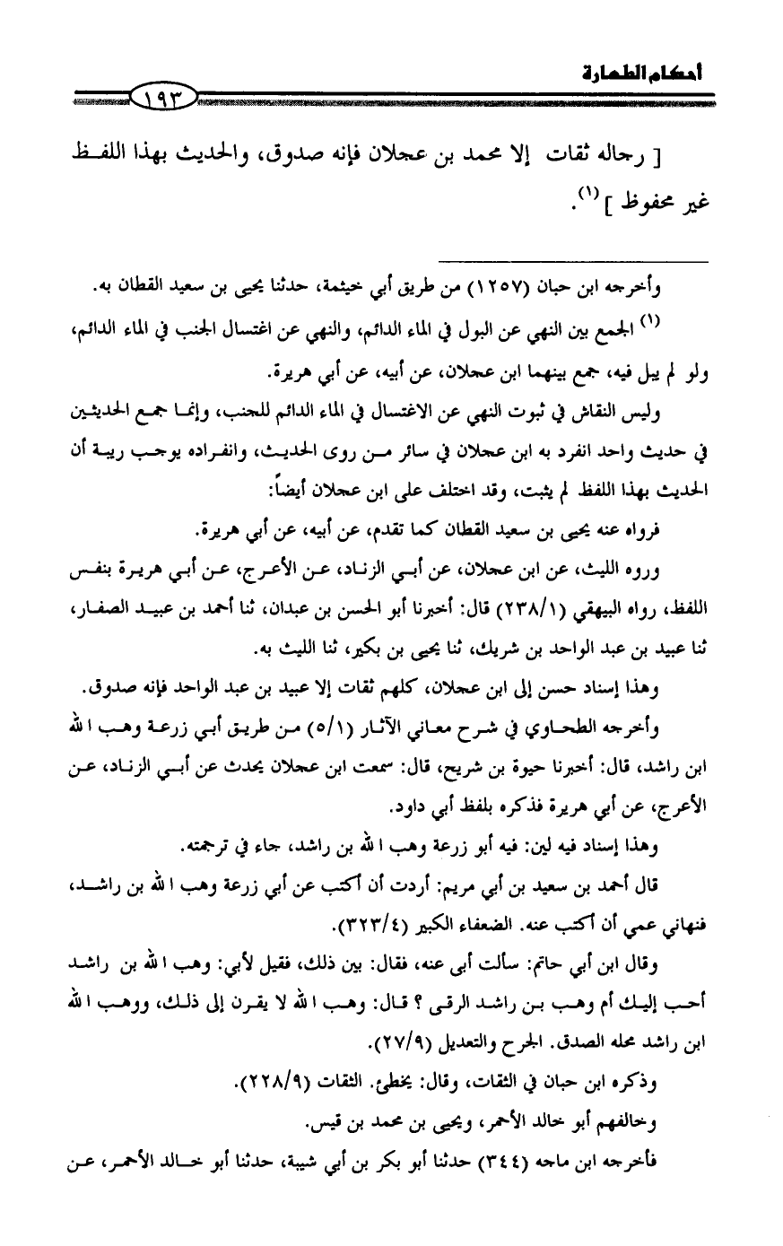 وليس النقاش في ثبوت النهي عن الاغتسال في الماء الدائم للجنب، وإنما جمع الحديثين في حديث واحد انفرد به ابن عجلان في سائر من روى الحديث، وانفراده يوجب ريبة أن الحديث بهذا اللفظ لم يثبت، وقد اختلف على ابن عجلان أيضاً: