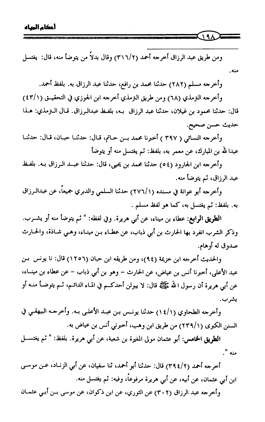 وأخرجه ابن الجارود (54) حدثنا محمد بن يحيى، قال: حدثنا عبد الرزاق به. بلفظ عبد الرزاق، ثم يتوضأ منه.