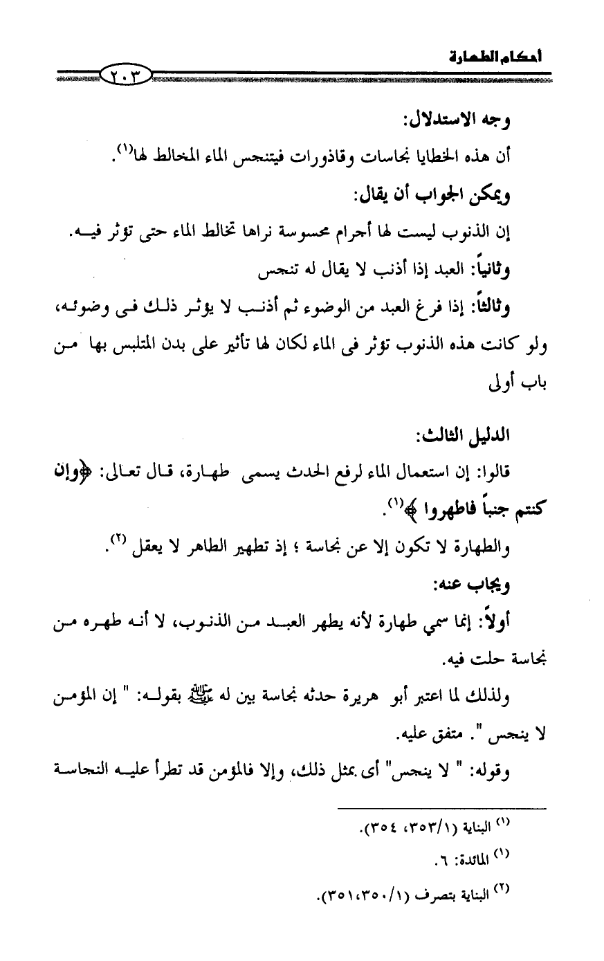 ولذلك لما اعتبر أبو هريرة حدثه نجاسة بين له - صلى الله عليه وسلم - بقوله: " إن المؤمن لا ينجس ". متفق عليه.