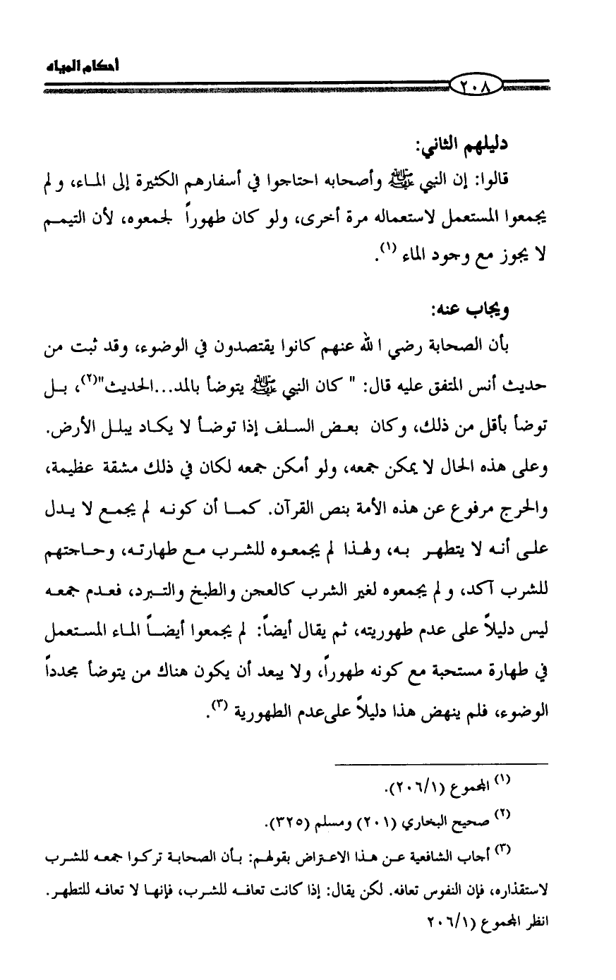 (¬3) أجاب الشافعية عن هذا الاعتراض بقولهم: بأن الصحابة تركوا جمعه للشرب لاستقذاره، فإن النفوس تعافه. لكن يقال: إذا كانت تعافه للشرب، فإنها لا تعافه للتطهر. انظر المجموع (1/ 206
