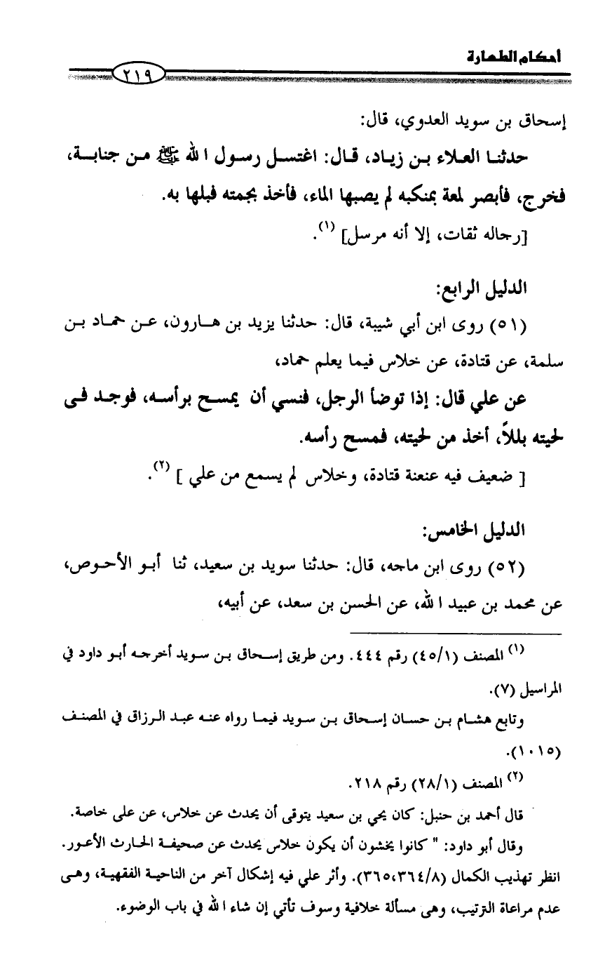 وقال أبو داود: " كانوا يخشون أن يكون خلاس يحدث عن صحيفة الحارث الأعور. انظر تهذيب الكمال (8/ 364،365). وأثر علي فيه إشكال آخر من الناحية الفقهية، وهى عدم مراعاة الترتيب، وهى مسألة خلافية وسوف تأتي إن شاء الله في باب الوضوء.