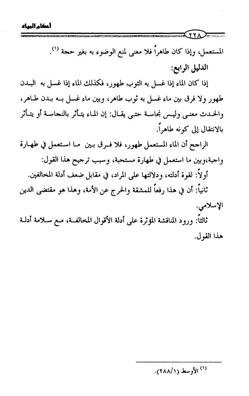 المستعمل، وإذا كان طاهراً فلا معنى لمنع الوضوء به بغير حجة (¬1).