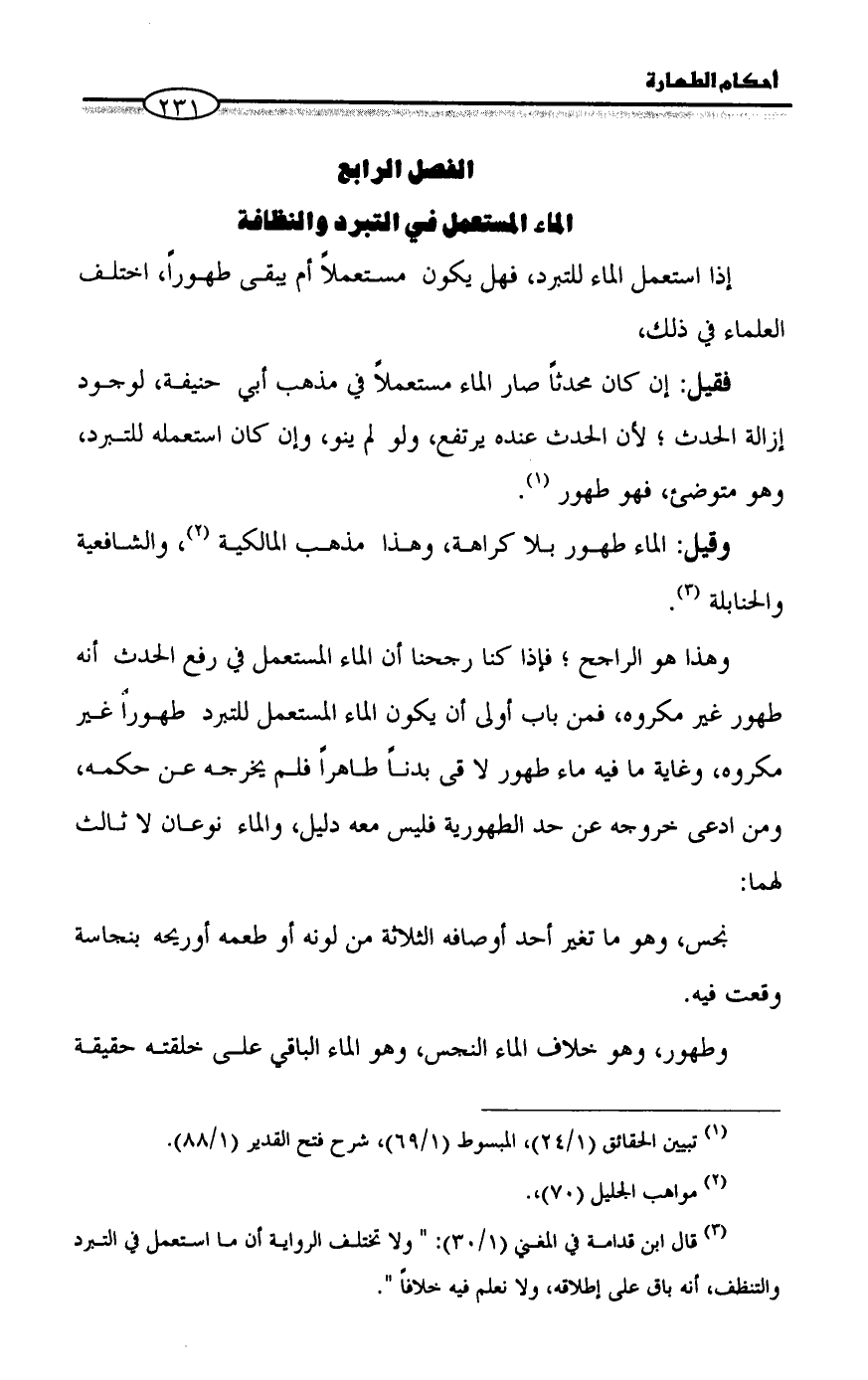 (¬3) قال ابن قدامة في المغني (1/ 30): " ولا تختلف الرواية أن ما استعمل في التبرد والتنظف، أنه باق على إطلاقه، ولا نعلم فيه خلافاً ".