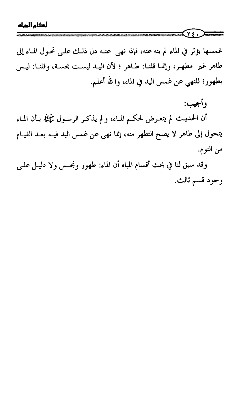 وقد سبق لنا في بحث أقسام المياه أن الماء: طهور ونجس ولا دليل على وجود قسم ثالث.
