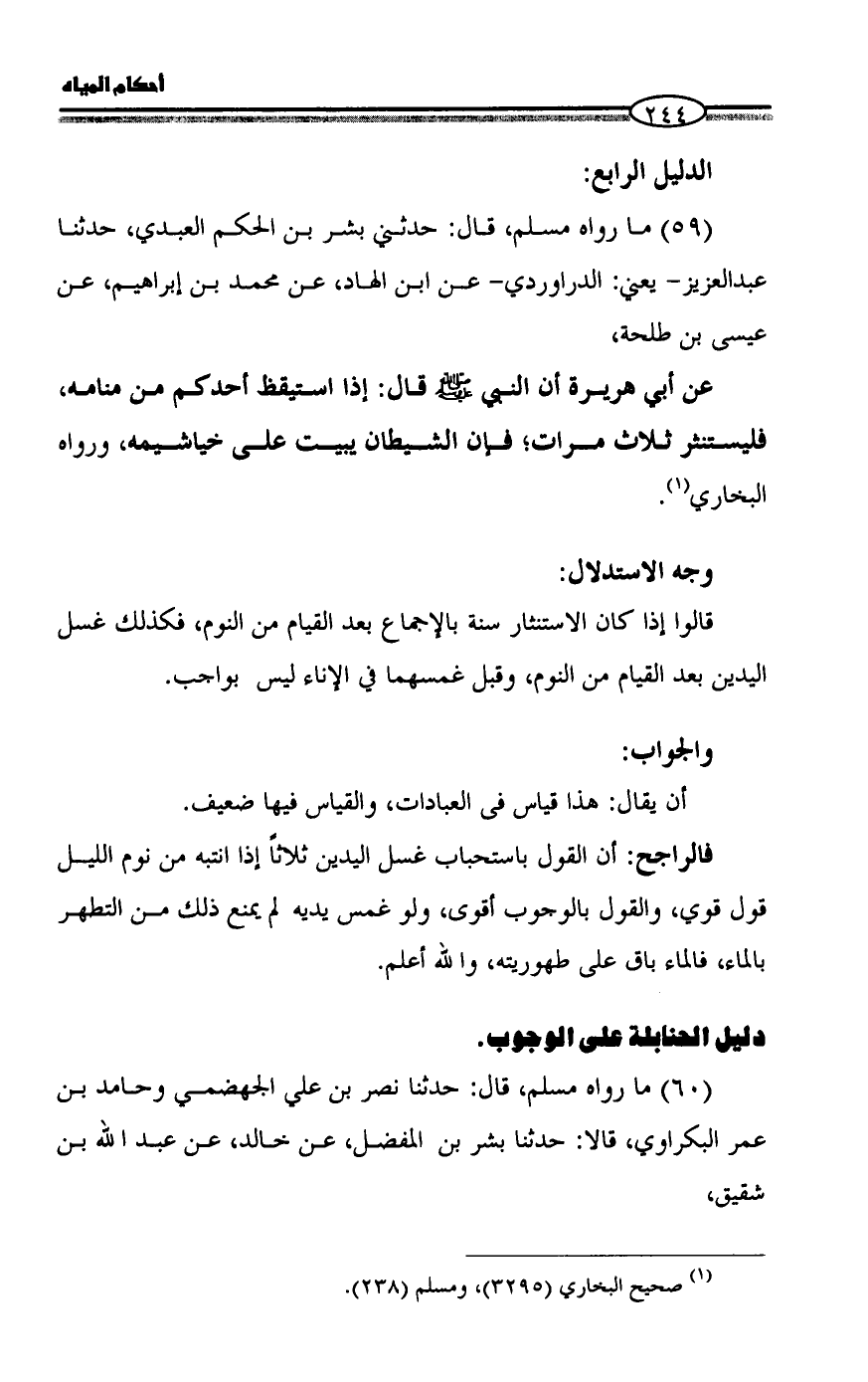 قالوا إذا كان الاستنثار سنة بالإجماع بعد القيام من النوم، فكذلك غسل اليدين بعد القيام من النوم، وقبل غمسهما في الإناء ليس بواجب.