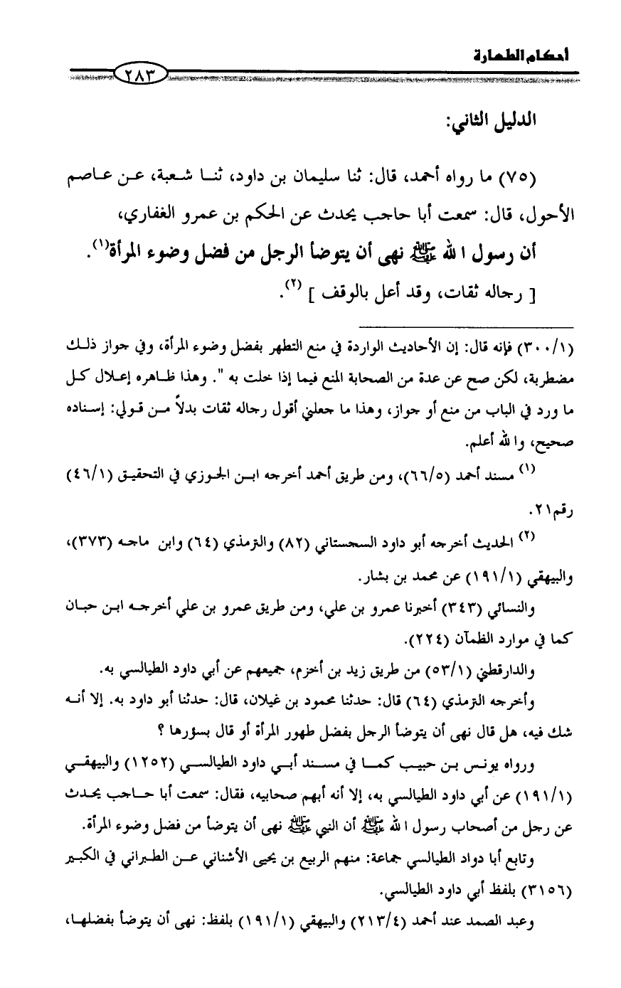 = (1/ 300) فإنه قال: إن الأحاديث الواردة في منع التطهر بفضل وضوء المرأة، وفي جواز ذلك مضطربة، لكن صح عن عدة من الصحابة المنع فيما إذا خلت به ". وهذا ظاهره إعلال كل ما ورد في الباب من منع أو جواز، وهذا ما جعلني أقول رجاله ثقات بدلاً من قولي: إسناده صحيح، والله أعلم.
