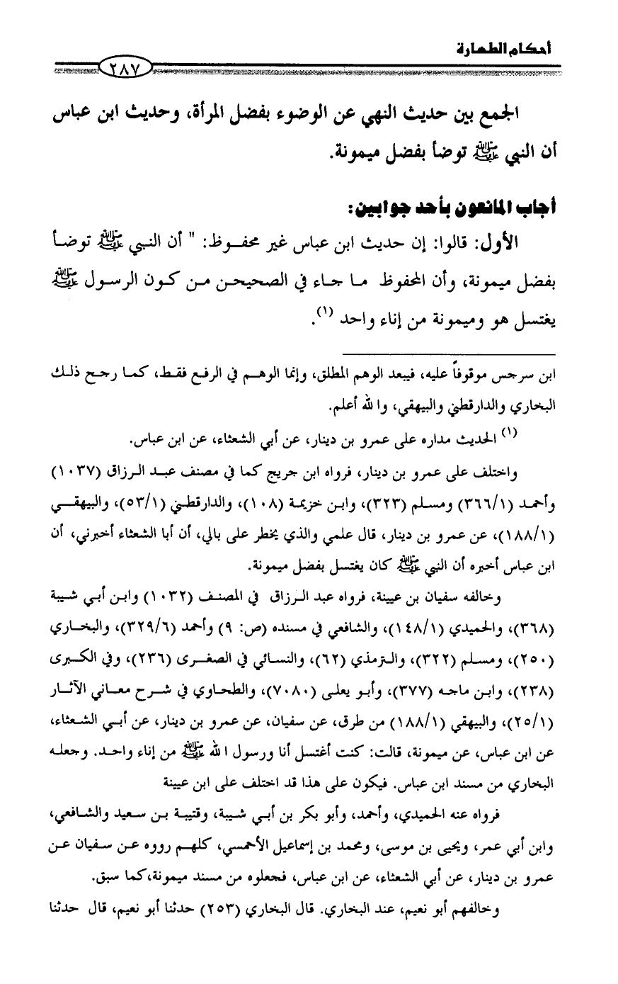 الأول: قالوا: إن حديث ابن عباس غير محفوظ: " أن النبي - صلى الله عليه وسلم - توضأ بفضل ميمونة، وأن المحفوظ ما جاء في الصحيحن من كون الرسول - صلى الله عليه وسلم - يغتسل هو وميمونة من إناء واحد (¬1).