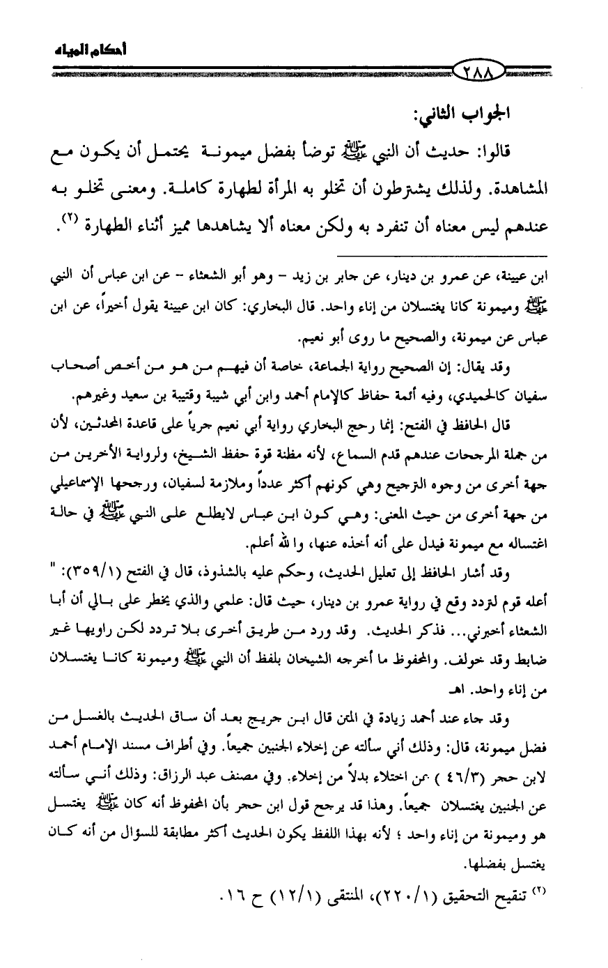 = ابن عيينة، عن عمرو بن دينار، عن جابر بن زيد - وهو أبو الشعثاء - عن ابن عباس أن النبي - صلى الله عليه وسلم - وميمونة كانا يغتسلان من إناء واحد. قال البخاري: كان ابن عيينة يقول أخيراً، عن ابن عباس عن ميمونة، والصحيح ما روى أبو نعيم.