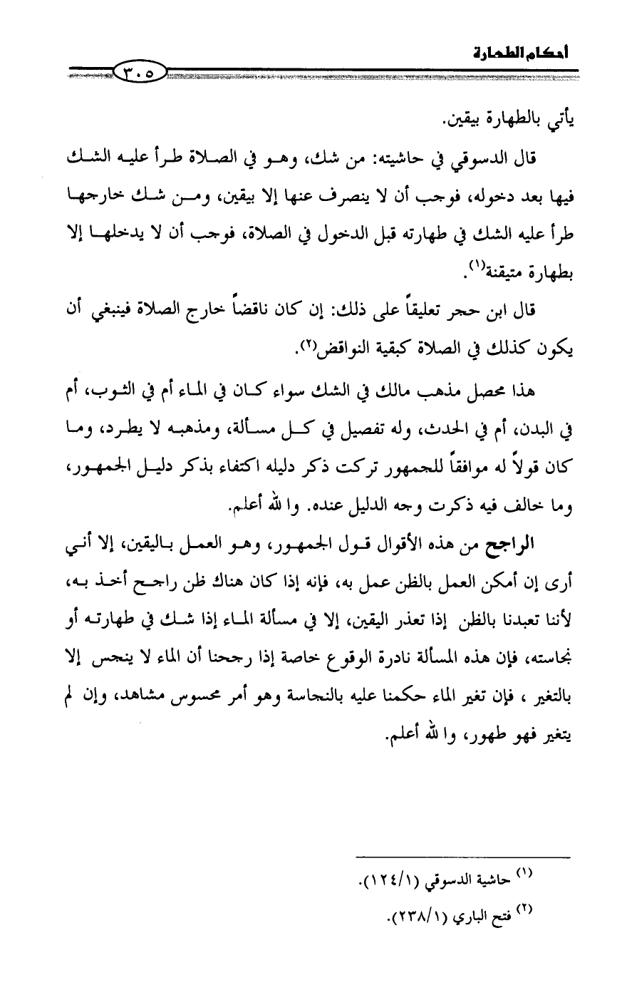 الراجح من هذه الأقوال قول الجمهور، وهو العمل باليقين، إلا أني أرى إن أمكن العمل بالظن عمل به، فإنه إذا كان هناك ظن راجح أخذ به، لأننا تعبدنا بالظن إذا تعذر اليقين، إلا في مسألة الماء إذا شك في طهارته أو نجاسته، فإن هذه المسألة نادرة الوقوع خاصة إذا رجحنا أن الماء لا ينجس إلا بالتغير، فإن تغير الماء حكمنا عليه بالنجاسة وهو أمر محسوس مشاهد، وإن لم يتغير فهو طهور، والله أعلم.