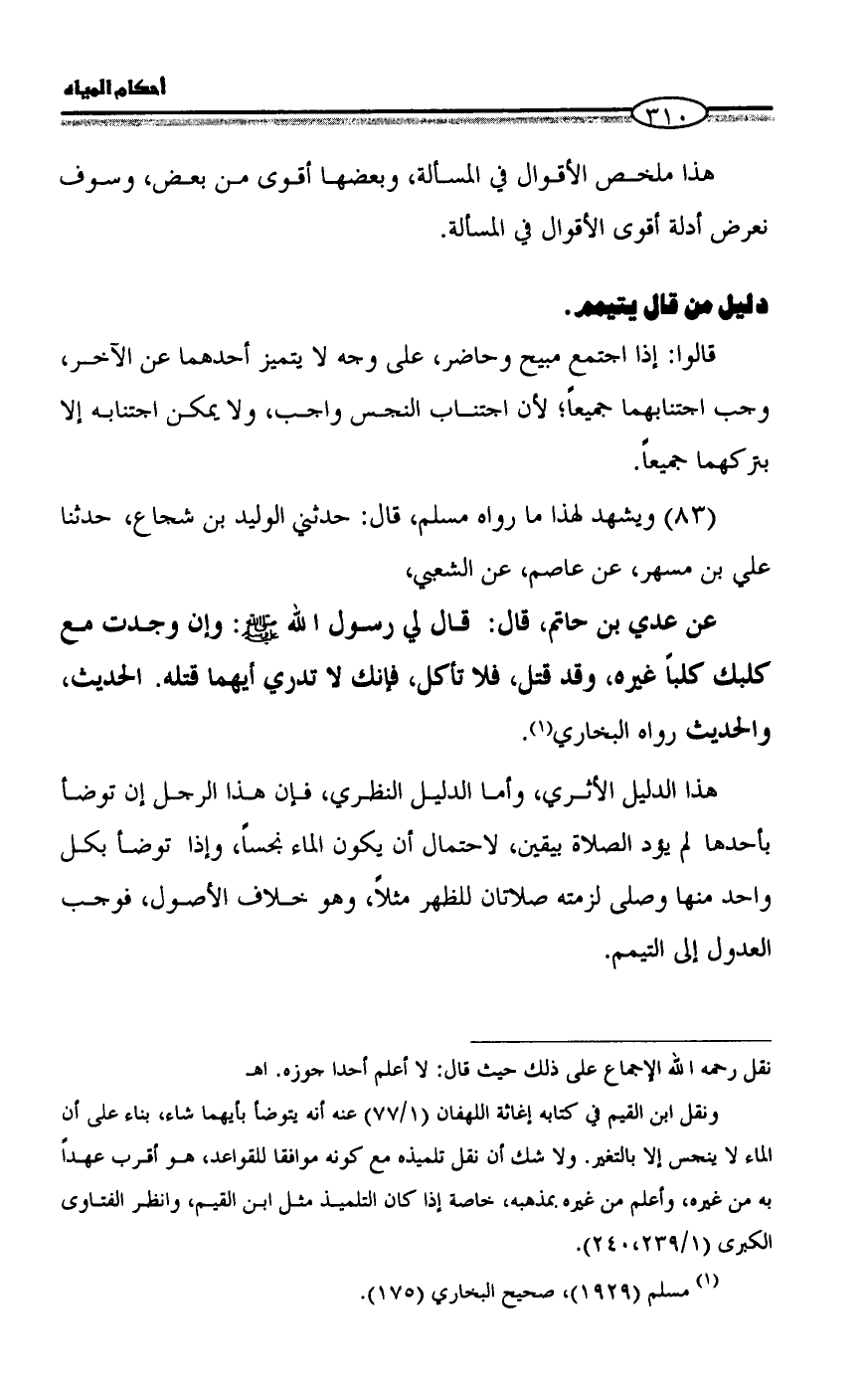 هذا الدليل الأثري، وأما الدليل النظري، فإن هذا الرجل إن توضأ بأحدها لم يؤد الصلاة بيقين، لاحتمال أن يكون الماء نجساً، وإذا توضأ بكل واحد منها وصلى لزمته صلاتان للظهر مثلاً، وهو خلاف الأصول، فوجب العدول إلى التيمم.