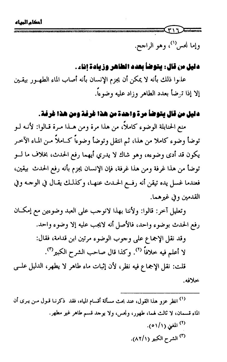 (¬1) انظر عزو هذا القول، عند بحث مسألة أقسام المياه، فقد ذكرنا قول من يرى أن الماء قسمان، لا ثالث لهما، طهور، ونجس، ولا يوجد قسم طاهر غير مطهر.