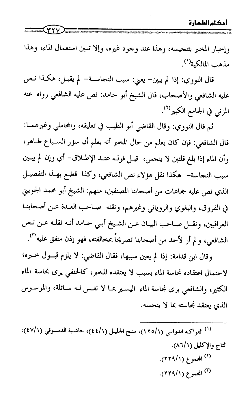 (¬1) الفواكه الدواني (1/ 125)، منح الجليل (1/ 44)، حاشية الدسوقي (1/ 47)، التاج والإكليل (1/ 86).