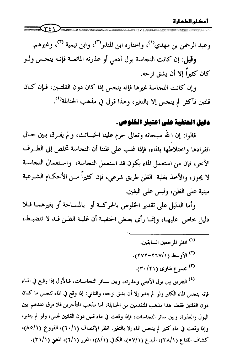 (¬4) التفريق بين بول الآدمي وعذرته، وبين سائر النجاسات، فالأول إذا وقع في الماء فإنه ينجس الماء الكثير ولو لم يتغير إلا أن يشق نزحه، والثاني: إذا وقع في الماء تنجس ما كان دون القلتين فقط، هذا مذهب المتقدمين من الحنابلة، أما مذهب المتأخرين فلا فرق عندهم بين البول والعذرة، وبين سائر النجاسات، فإذا وقعت في ماء قليل دون القلتين نجس، ولو لم يتغير، وإذا وقعت في ماء كثير لم ينجس الماء إلا بالتغير. انظر الإنصاف (1/ 60)، الفروع (1/ 85)، كشاف القناع (1/ 38)، المبدع (1/ 57)، الكافي (1/ 8)، المحرر (1/ 2)، المغني (1/ 31).